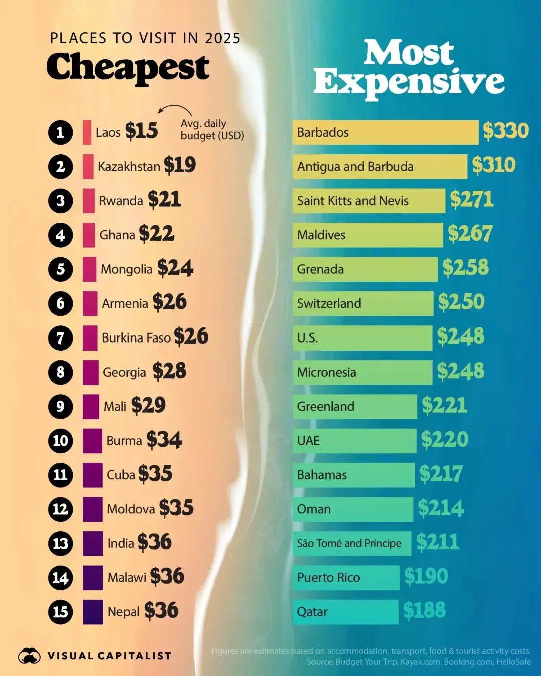 Бұл туралы VisualCapitalist порталында белгілі болды. Рейтинг BudgetYourTrip, Kayak.com, Booking.com және HelloSafe сияқты туристік платформалар деректеріне сүйене отырып жасалған.
