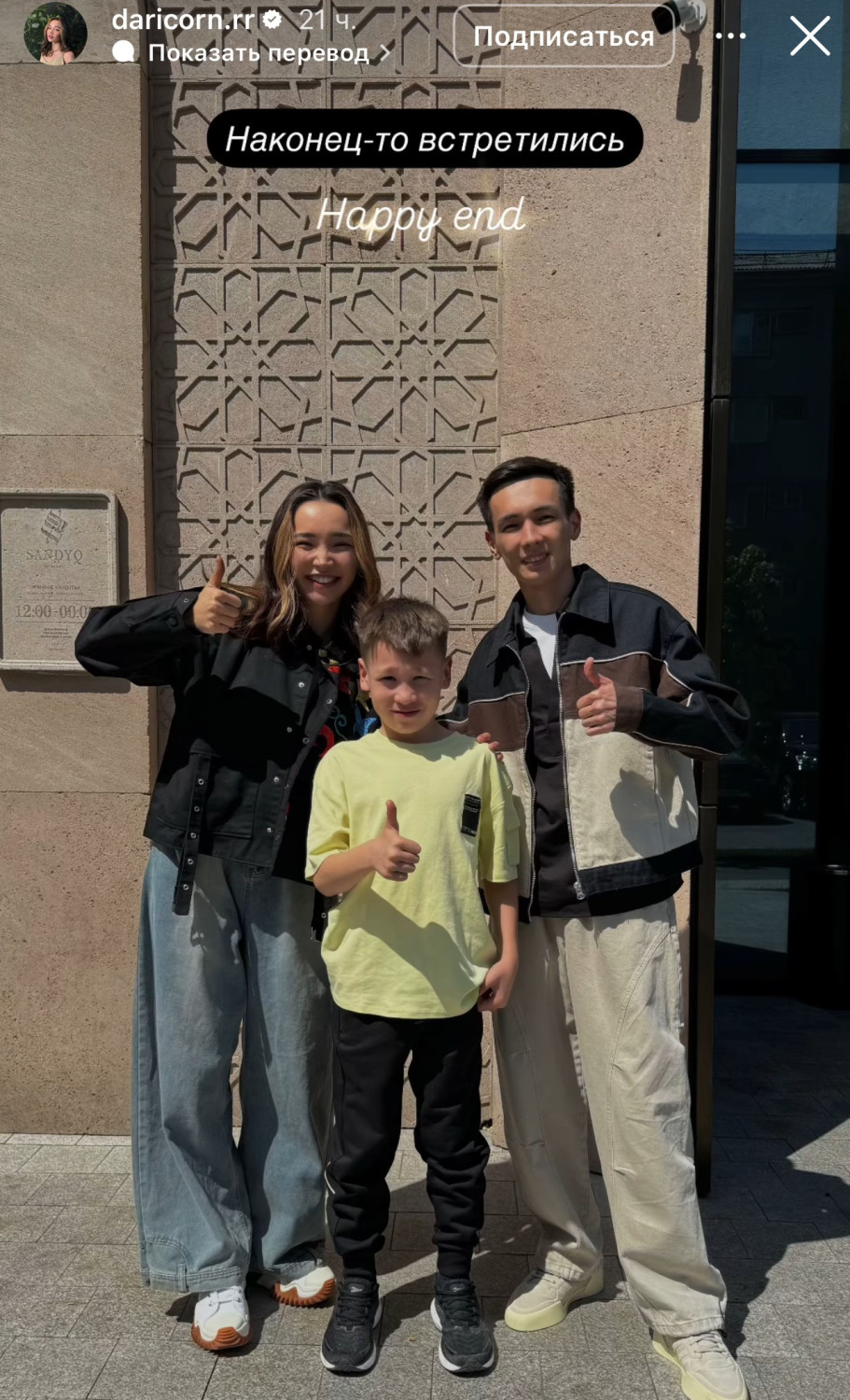 Кездесу барысында ол бала мен оның анасын құшақтап, достық ниетін білдірді. Daricorn кейін Instagram-да балақаймен түскен фотосының астына «Happy end» деп жазды.