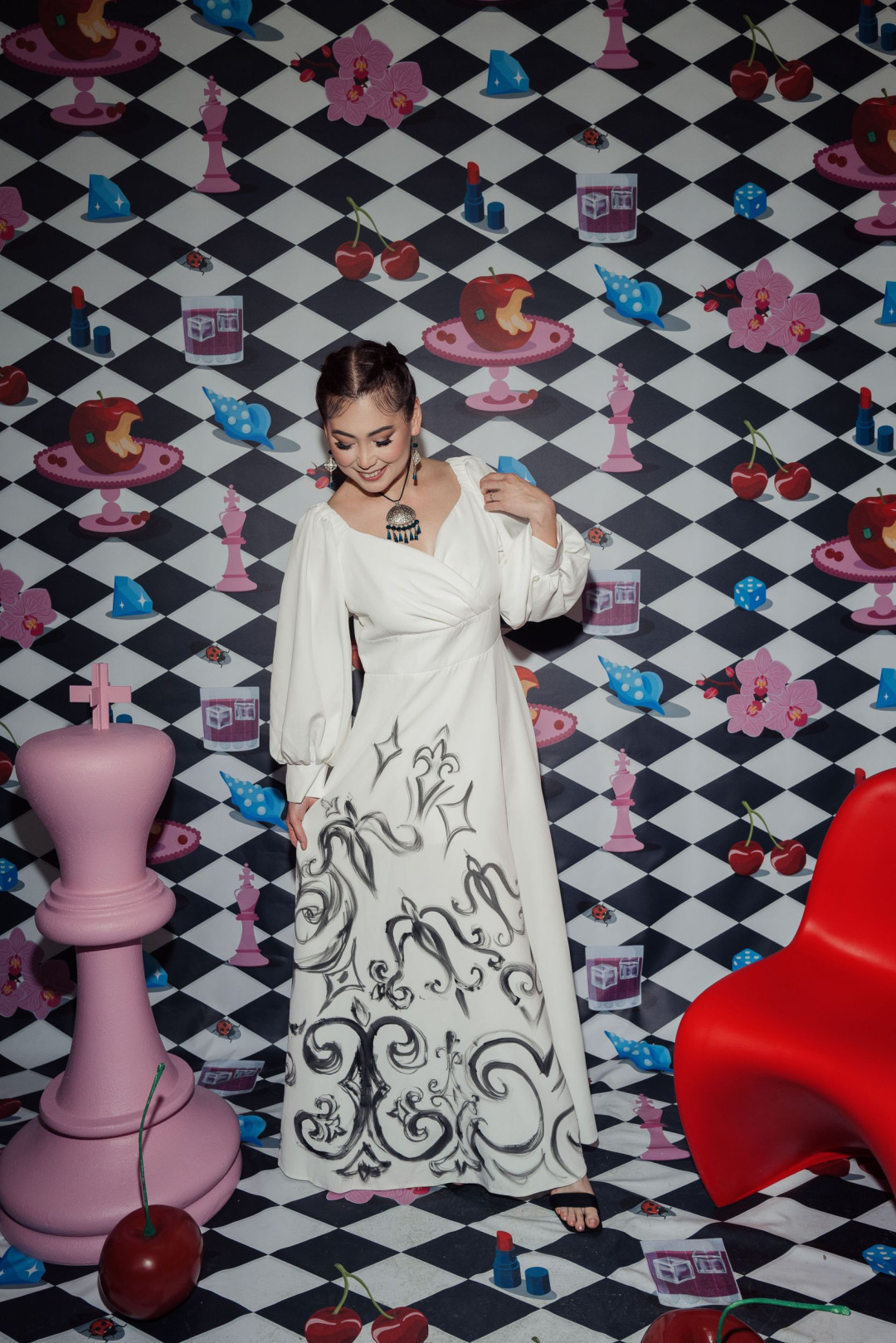 Этим ощущением живого диалога дышала и перформативная часть вечера. Дизайнер-иллюстратор Анелия Бекбасова и кобызистка Ляйля Тажибаева представили дуэт, где музыка и рисунок появлялись синхронно. Одна играла на кобызе, другая наносила орнаменты на белоснежное платье музыканта. Гости наблюдали, как звук превращается в линию, а движение кисти — в продолжение мелодии.