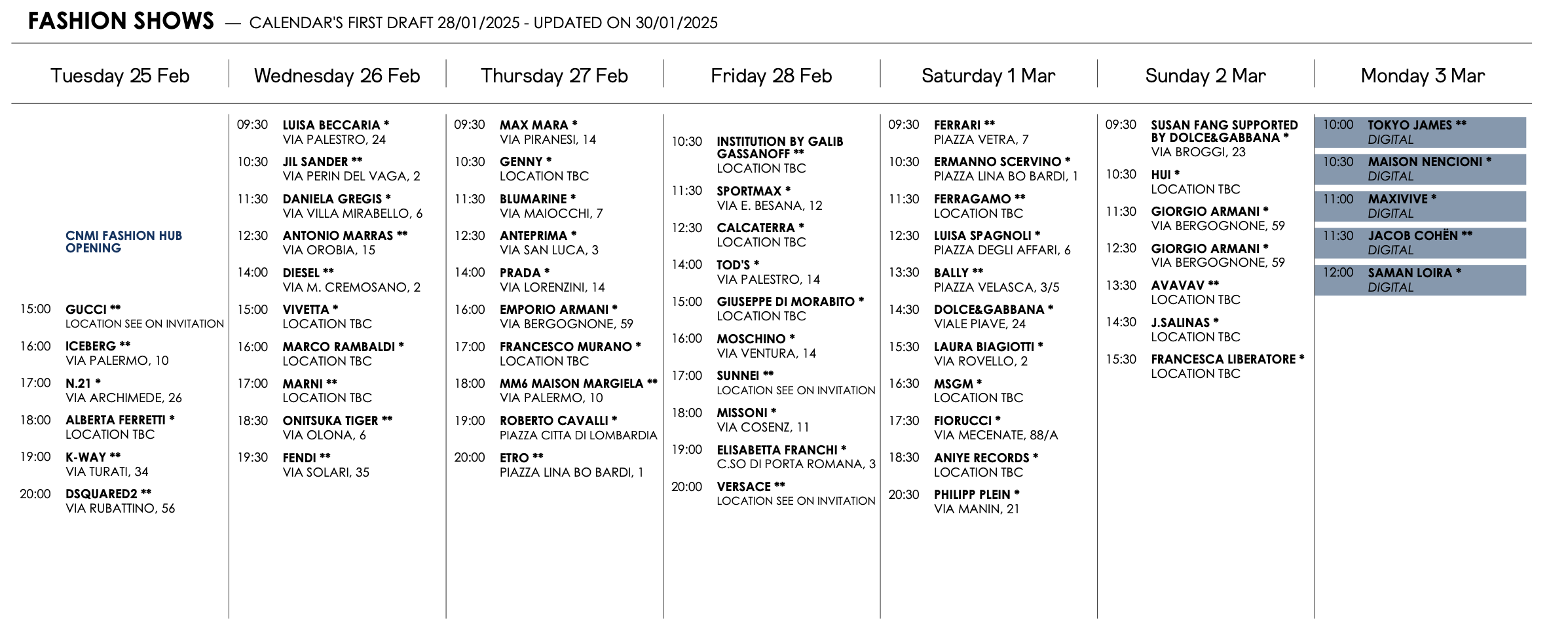 В целом, грядущая Неделя моды в Милане обещает быть особенно захватывающей, ведь многие бренды готовятся к важным юбилеям и дебютам. В этом году Dsquared2 отметит свое 30-летие. Наряду с этим намечено целых три дебюта: Лоренцо Серафини в роли креативного директора Alberta Ferretti, Альберто Калири — Missoni, а также Давида Комы для Blumarine.