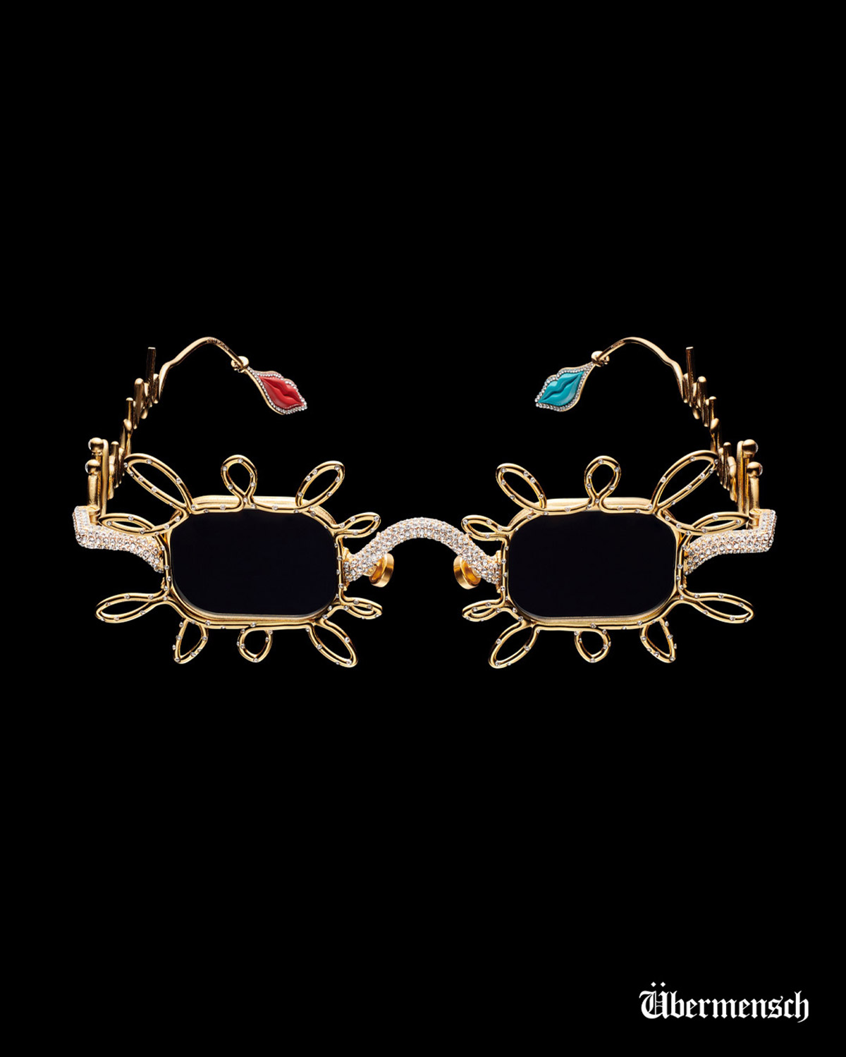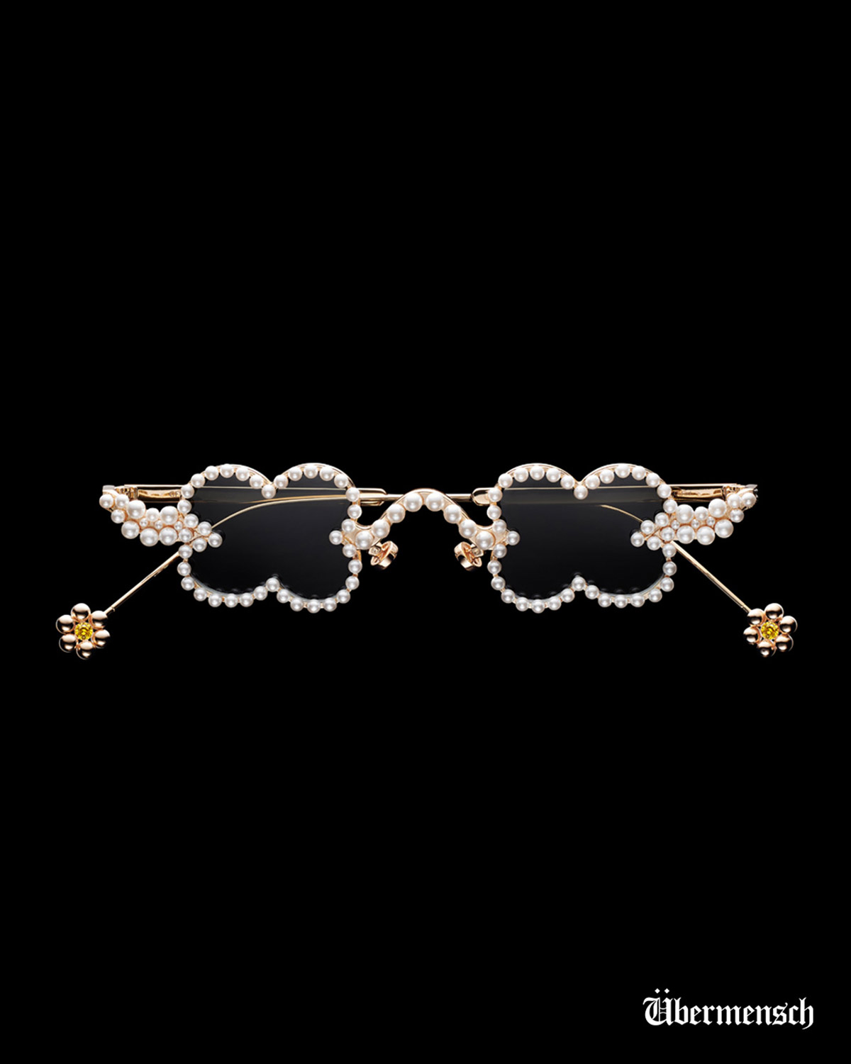 Первая модель коллекции — Ubermensch — в буквальном смысле пропитана символизмом. Здесь, вдоль дужек, можно увидеть золотые лепестки маргаритки и название альбома Ubermensch, как если бы G-DRAGON подписал эти очки. А еще — подвески в виде красных и синих губ. Это как вспышка игривости на фоне серьезности, как напоминание о том, что за этим человеком всегда стоит ощущение легкости и желания нарушать правила. Вторая модель — Eye Cloud — украшена 168 жемчужинами, которые можно снимать и менять, создают форму облака, а также логотипом PEACEMINUSONE — бренда, принадлежащего G-DRAGON.