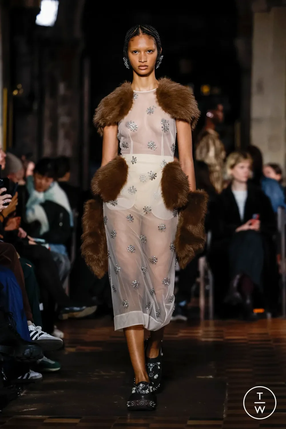 На шоу KNWLS модели предстали в коричневых жакетах и жилетах с меховыми воротниками и рукавами, а у Симоны Роша «мохнатые» детали расположились на бледно-розовом платье и даже черном мужском костюме.