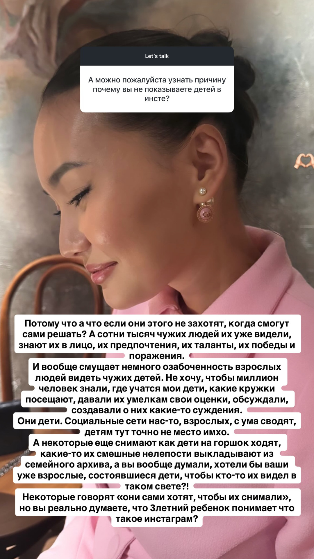 «Ал егер олар өскенде өздері шешім қабылдай алатын кезде “мені неге көрсеттің?” десе ше? Ал жүздеген мың адам оларды көріп үлгереді, жүзін, мінезін, қызығушылығын, жеңісі мен жеңілісін біліп қояды. Жалпы, ересектердің өзге адамдардың баласын көруге деген қызығушылығы мені аздап таңғалдырады», –