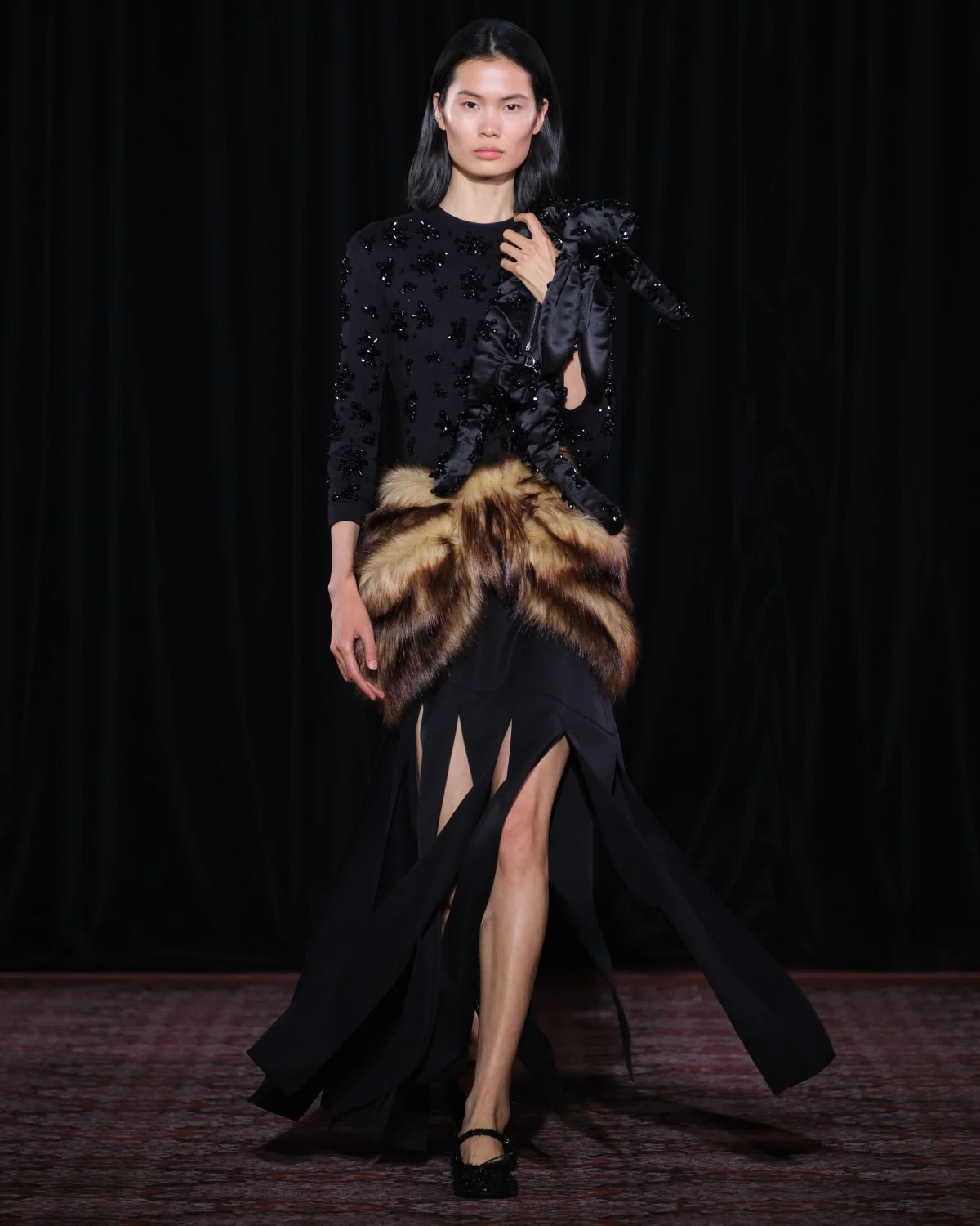 Симон медленно, но верно собирала элементы своих прошлых коллекций, чтобы создать нечто свежее и по-настоящему личное. Пышные плечи, банты и глиттер — все это привычные мотивы дизайнера, но на этот раз к ним добавилась целая армия ушастых компаньонов, выполненных из искусственного меха. Главными героями шоу стали зайцы и кролики — или, если быть точными, то ушастые во всех возможных вариациях. Они выглядывали из сумок, «служили» самими сумками, становились накидками и даже превращались в плюшевые муфты. Их глазки-бусинки смотрели прямо в душу, а в компании с ними скромно выступали черепашьи клатчи, будто напоминая: «Не торопись, главное — дойти до финиша».