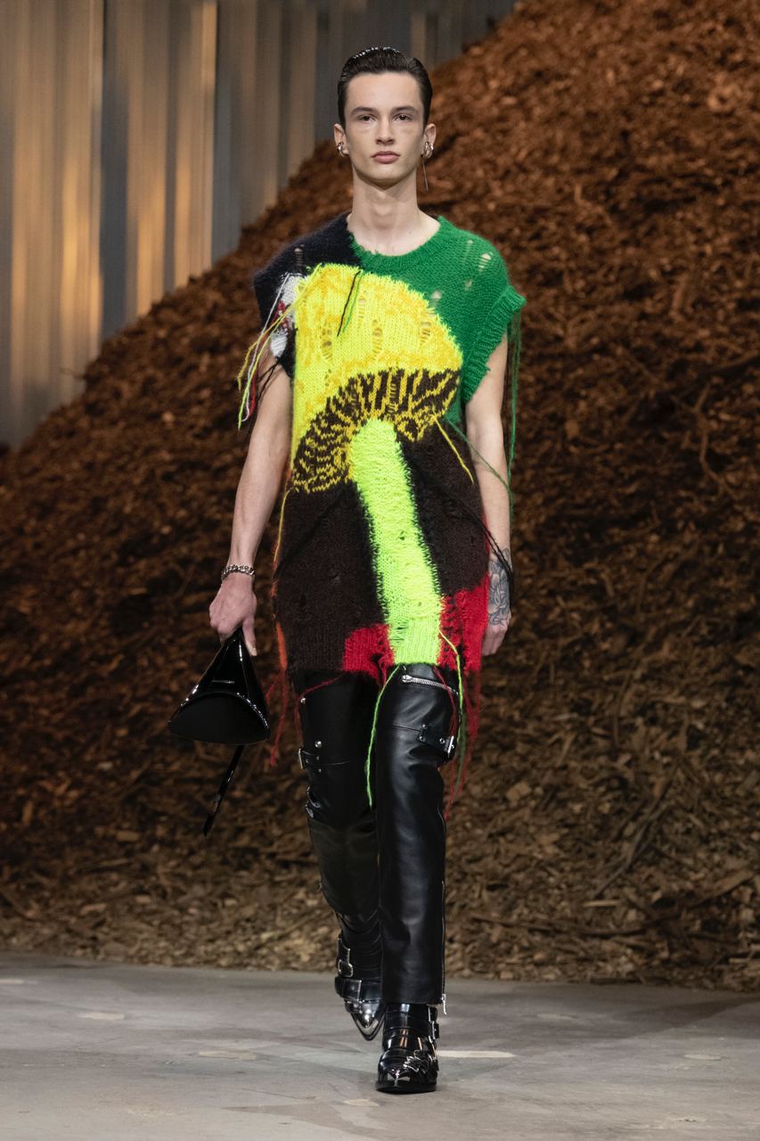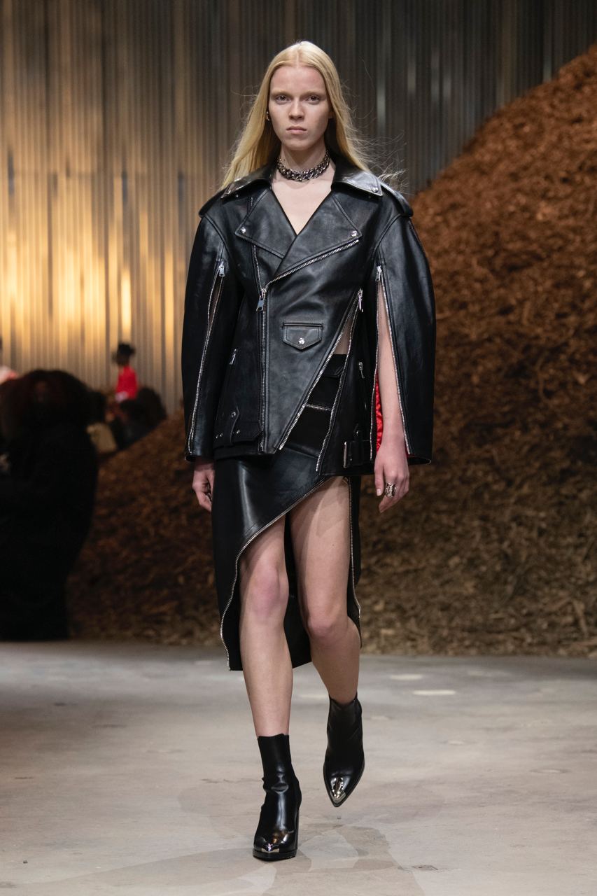 Коллекция представлена обилием асимметричного кроя и панк-отсылками – кожаные куртки и потертые, безразмерные вязаные вещи, которые напоминали о работе основателя бренда Ли МакКуина.