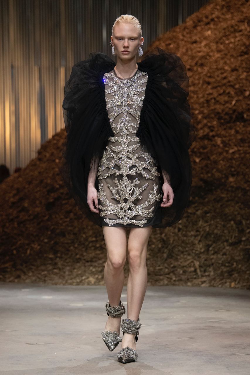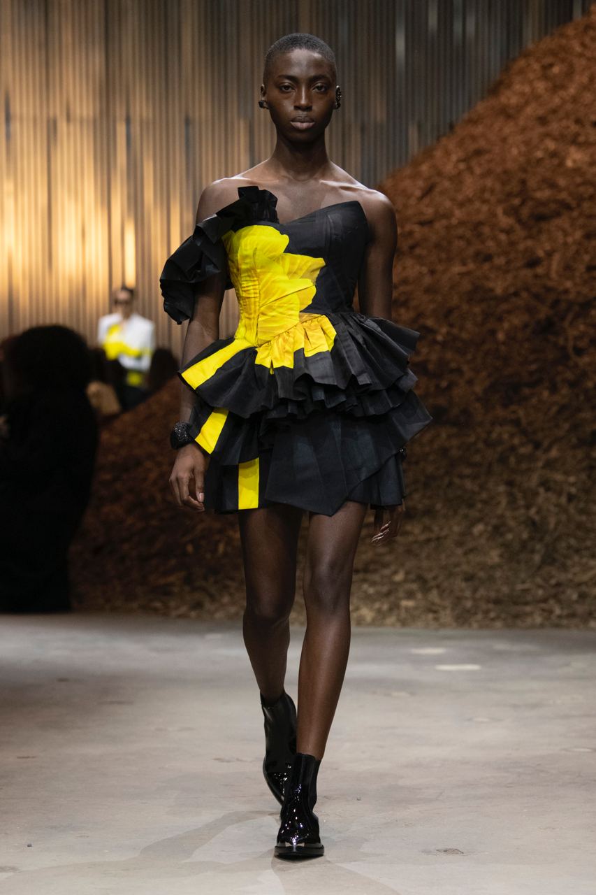 Показ открылся платьем бюстье из черной кожи с ассиметричным низом. Двубортные костюмы, которые выглядели так, будто они были окрашены баллончиком для краски, также напомнили работу основателя бренда, представленную весной 1999 года. Одна из моделей Бертона ходила в разноцветном вязаном свитере с огромным желтым грибом спереди. Безумство Сары Бертон также переросло и в другие образы – платья из черного тюля с вышивкой из хрустального бисера и пайеток.