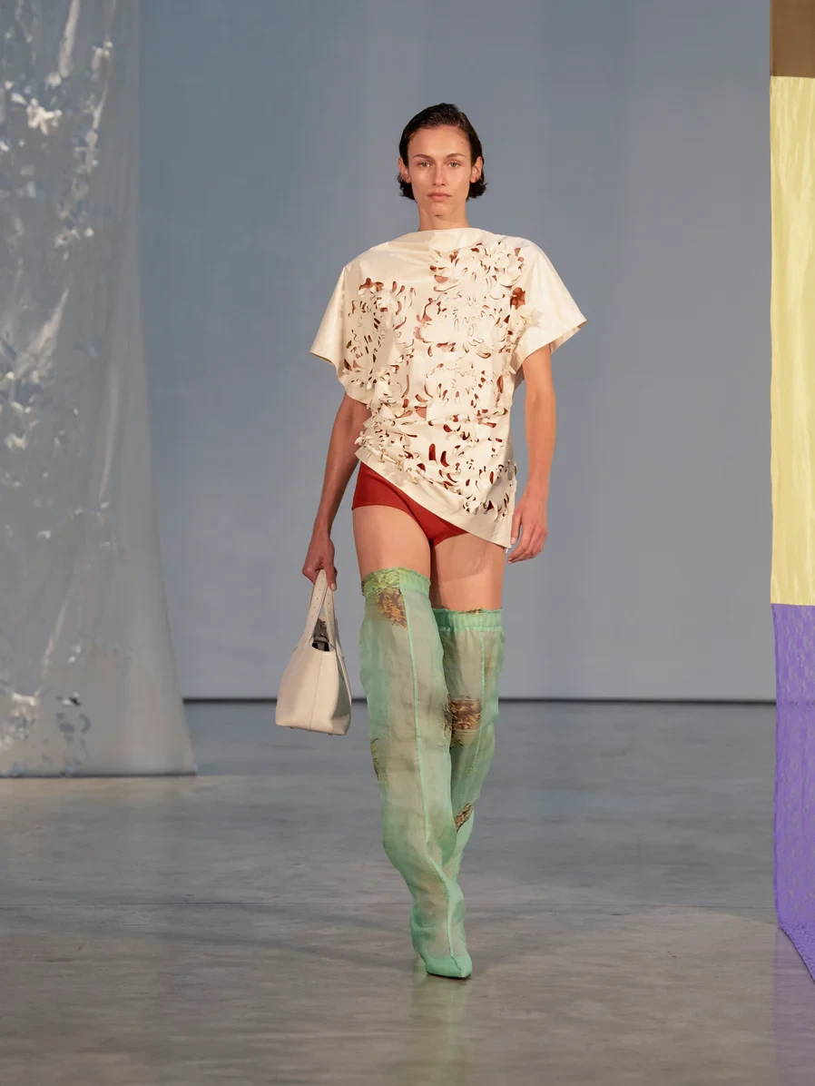 The Matriarch звучала как ода «альфа-женщине» — той, что умеет быть сильной и харизматичной, не теряя уязвимости. Именно эта многослойность женской натуры, по словам дизайнера, стала отправной точкой коллекции. На подиуме один за другим выходили приталенные жакеты с разрезами под грудью и по линии бедер, отсылающими к бумажным скульптурам тайского художника Ву Дан Тана, за ними — ультракороткие юбки, рубашки с чашеобразными лифами и шубы из искусственного меха. А завершали историю платья-комбинации с тонкой кружевной отделкой, созданные с использованием передовых технологий вязки, и невесомые пончо из органзы.