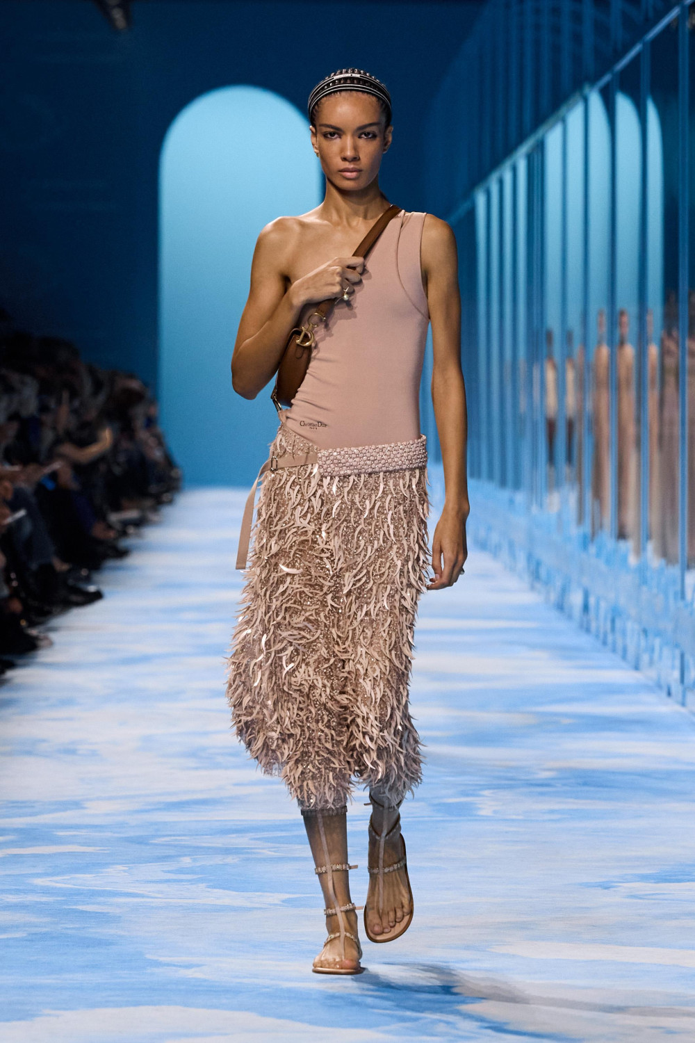 Мотокуртки, гоночные костюмы, брюки с лампасами и спортивные куртки с контрастными вставками — позже на подиуме появились образы, вдохновленные миром автоспорта. Логотип Dior Sport из 60-х годов, когда-то замеченный на лыжной одежде Джеки Кеннеди Онассис, был возрожден как главный мотив этого сезона. В финале линия перешла к повседневным и вечерним образам: платья с открытыми плечами были задрапированы, рубашки подвергались экспериментам с кроем, а классические тренчкоты были обрезаны у плеча.