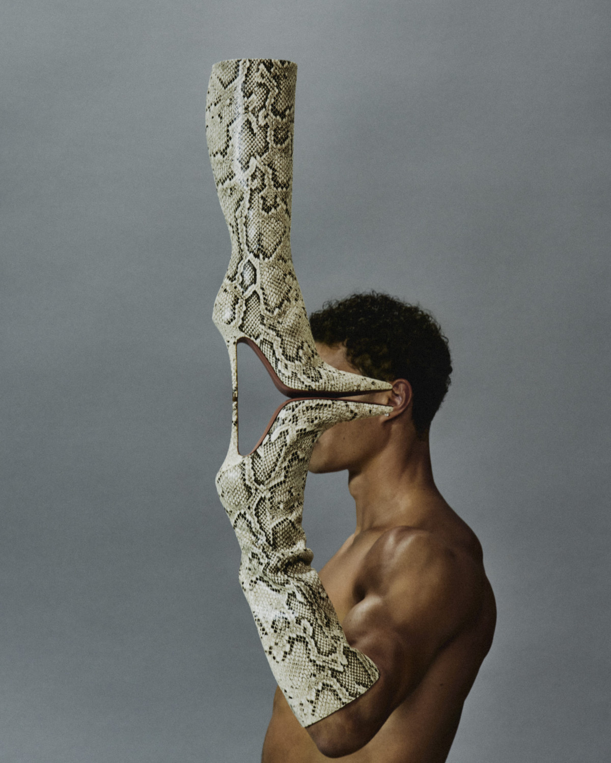 Амина Муадди, известная своим смелым подходом к дизайне, представила новую коллекцию своего одноименного бренда, сочетающую элегантность и дерзость. Она посвящена празднованию женской силы, а ее рекламная кампания добавляет обуви фетишизированный и провокационный оттенок.