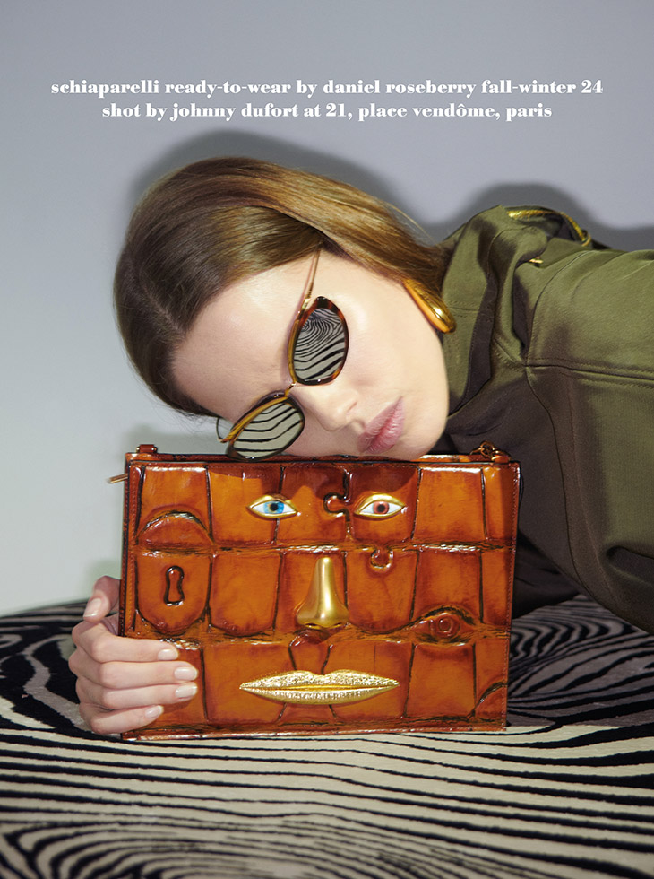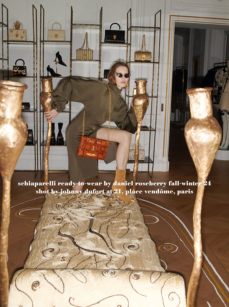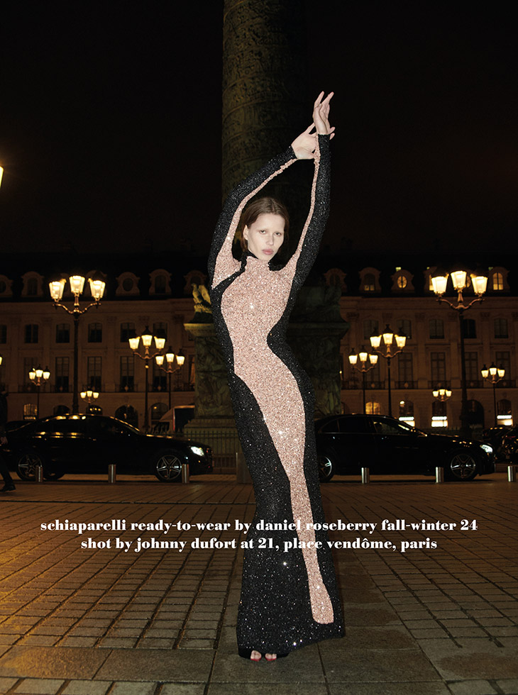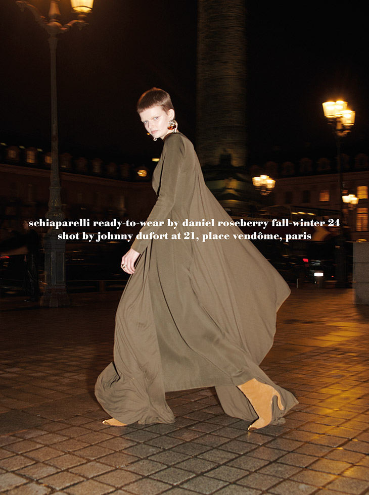 Schiaparelli представил осеннюю кампанию, которая виртуозно сочетает элементы сюрреализма и изысканную элегантность. На фоне площади Вандом модели, облаченные в сверкающие платья, словно выходят прямиком с подиума в ночной Париж, играя в свете проезжающих машин.