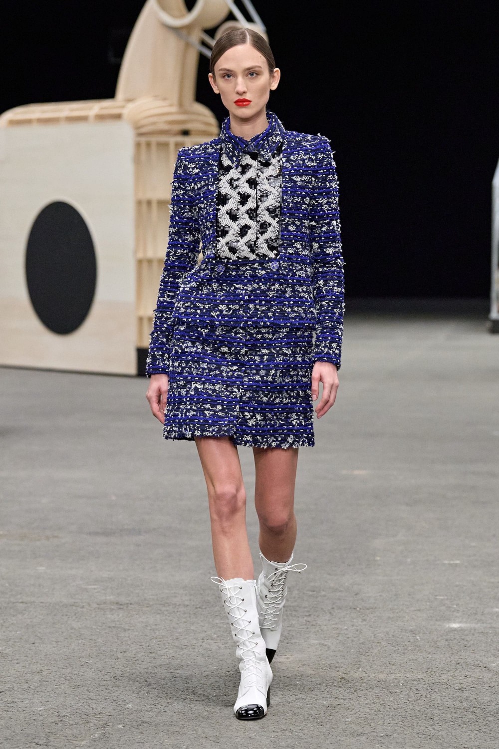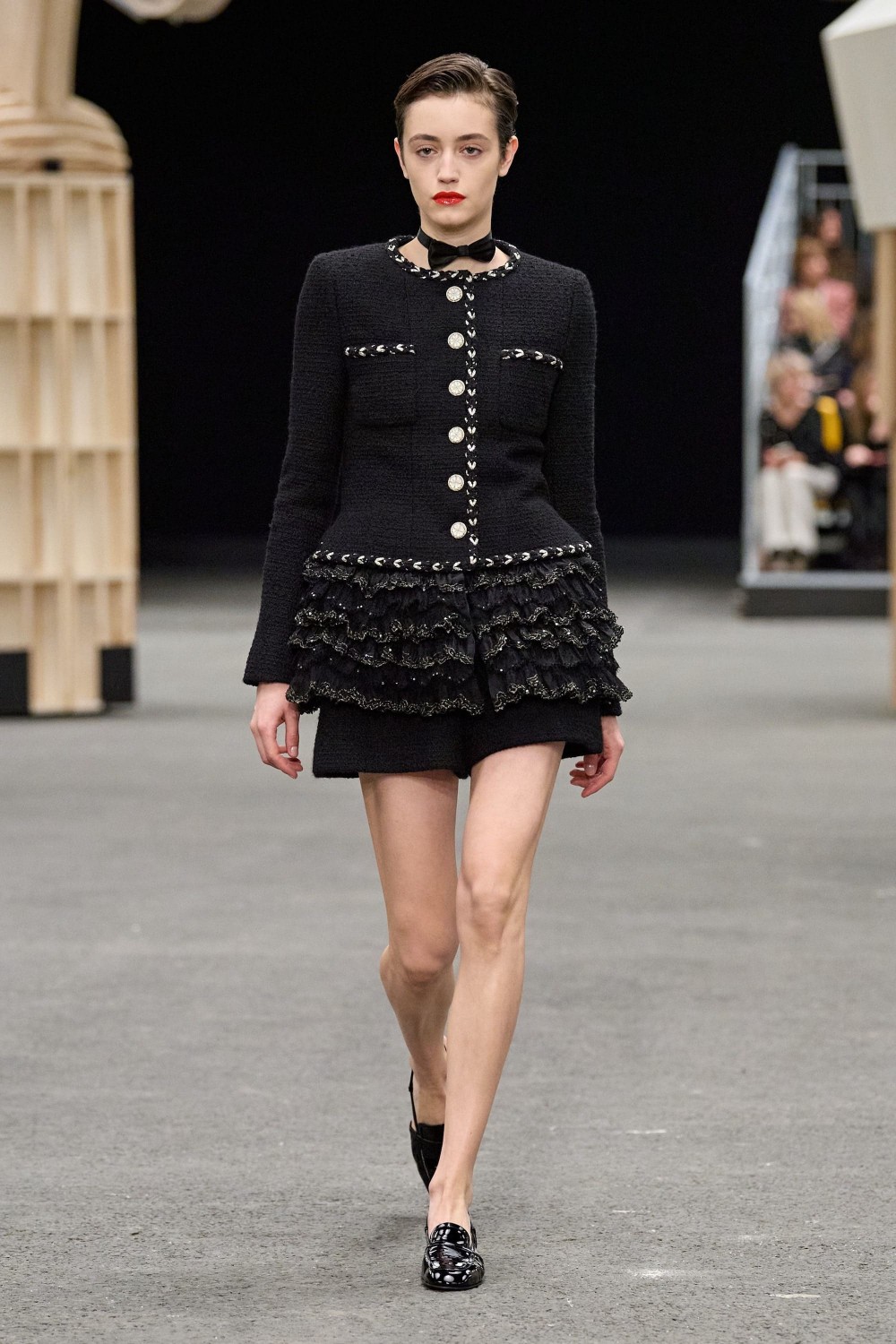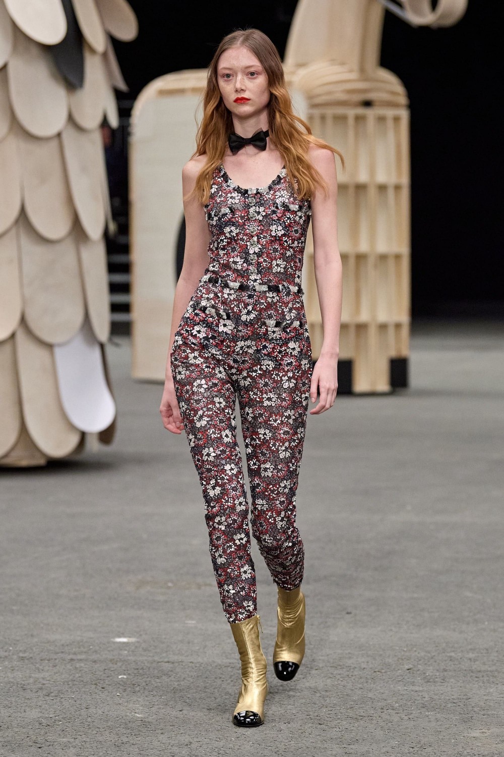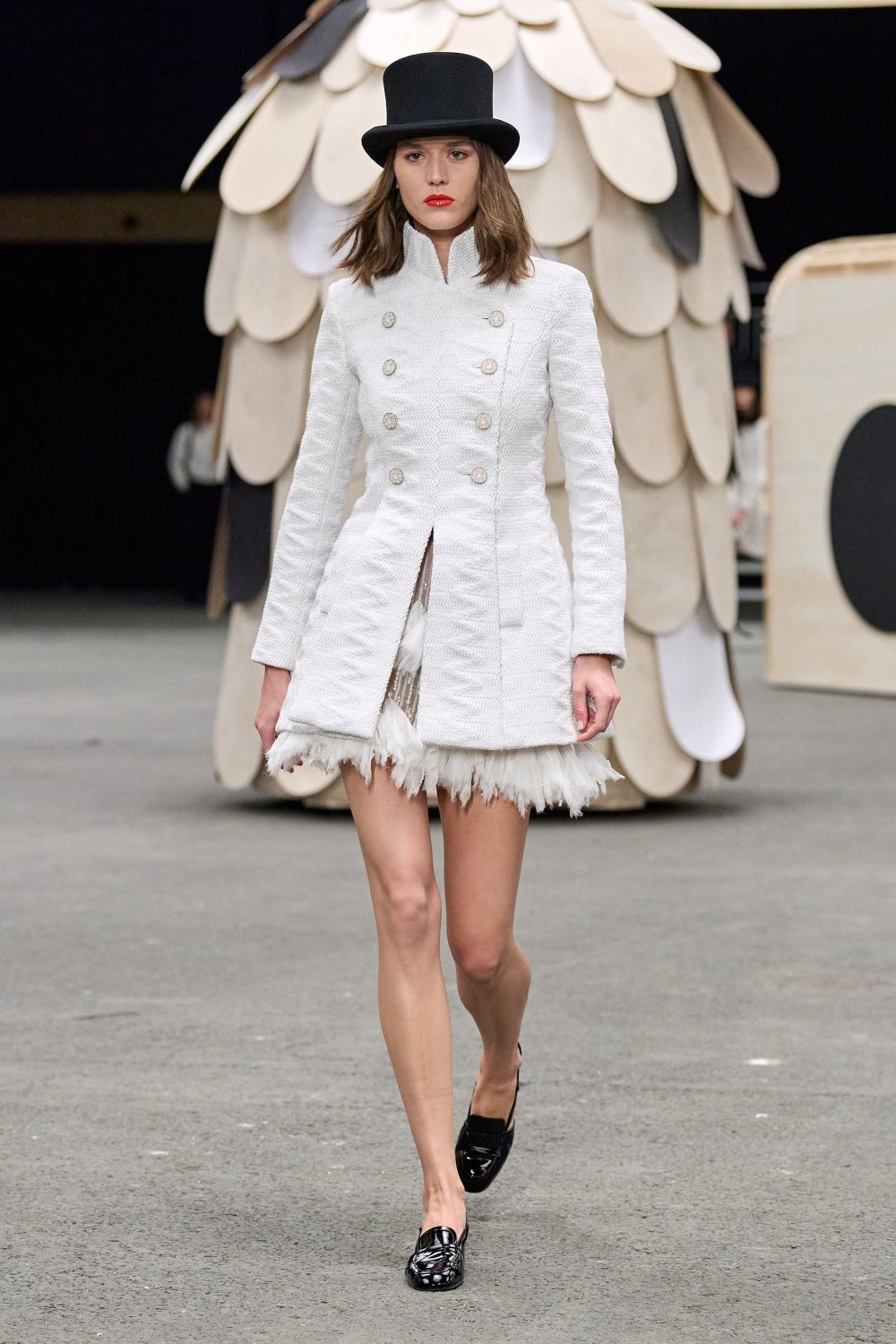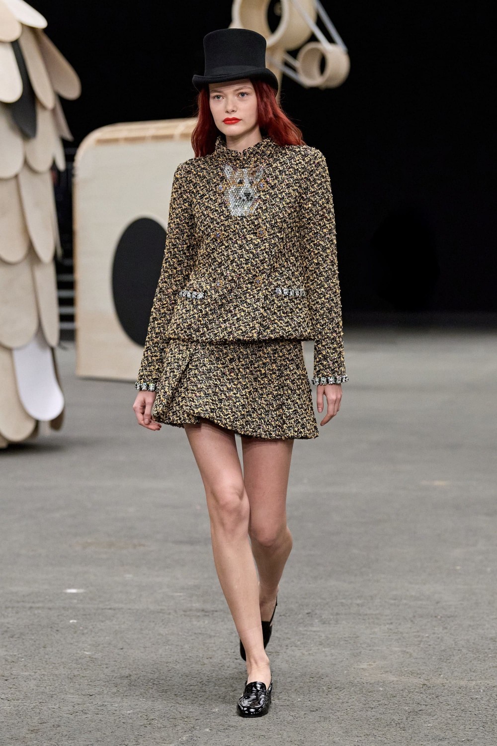 Вдохновение креативный директор бренда Виржини Виар черпала в квартире Коко Шанель на улице Камбон, 31. Модели на показе проходили мимо одиннадцати огромных скульптур животных, созданных из дерева, картона и бумаги художником Ксавьером Вейланом. Анималистичные мотивы прослеживаются и в образах. К примеру, один из жакетов украшен вышивкой с корги. Мини-наряды из твида, атласа и шелка дополнены галстуками-бабочками и шляпами-цилиндрами.