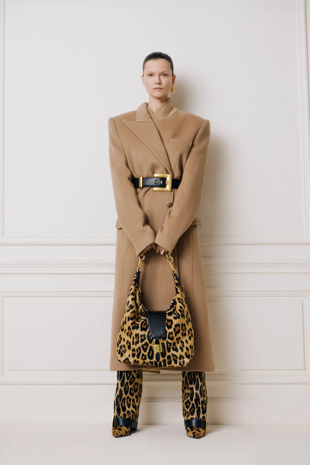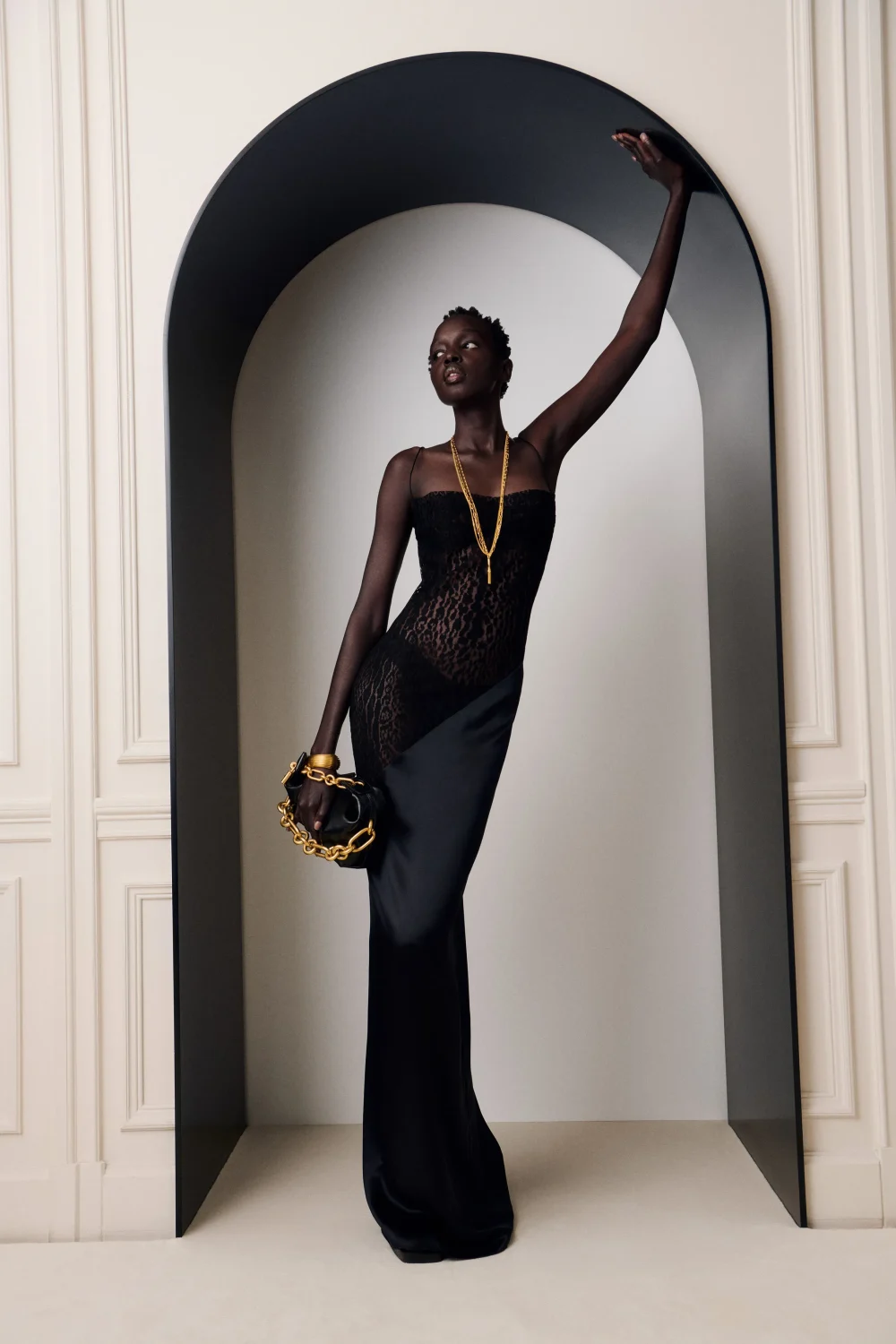 От офицерских мундиров до кепок газетчиков — Рустен вдохнул новую жизнь в исторические элементы, сделав их актуальными для наших дней. Пиджаки с остроконечными лацканами обрели новые пропорции, создавая выразительную геометрию, а куртки украсили объемные накладки на бедрах. Говоря о вечерней линии, то ее минималистичные силуэты искусно сочетаются с массивными элементами декора, такими как кристаллы и золотая фурнитура.