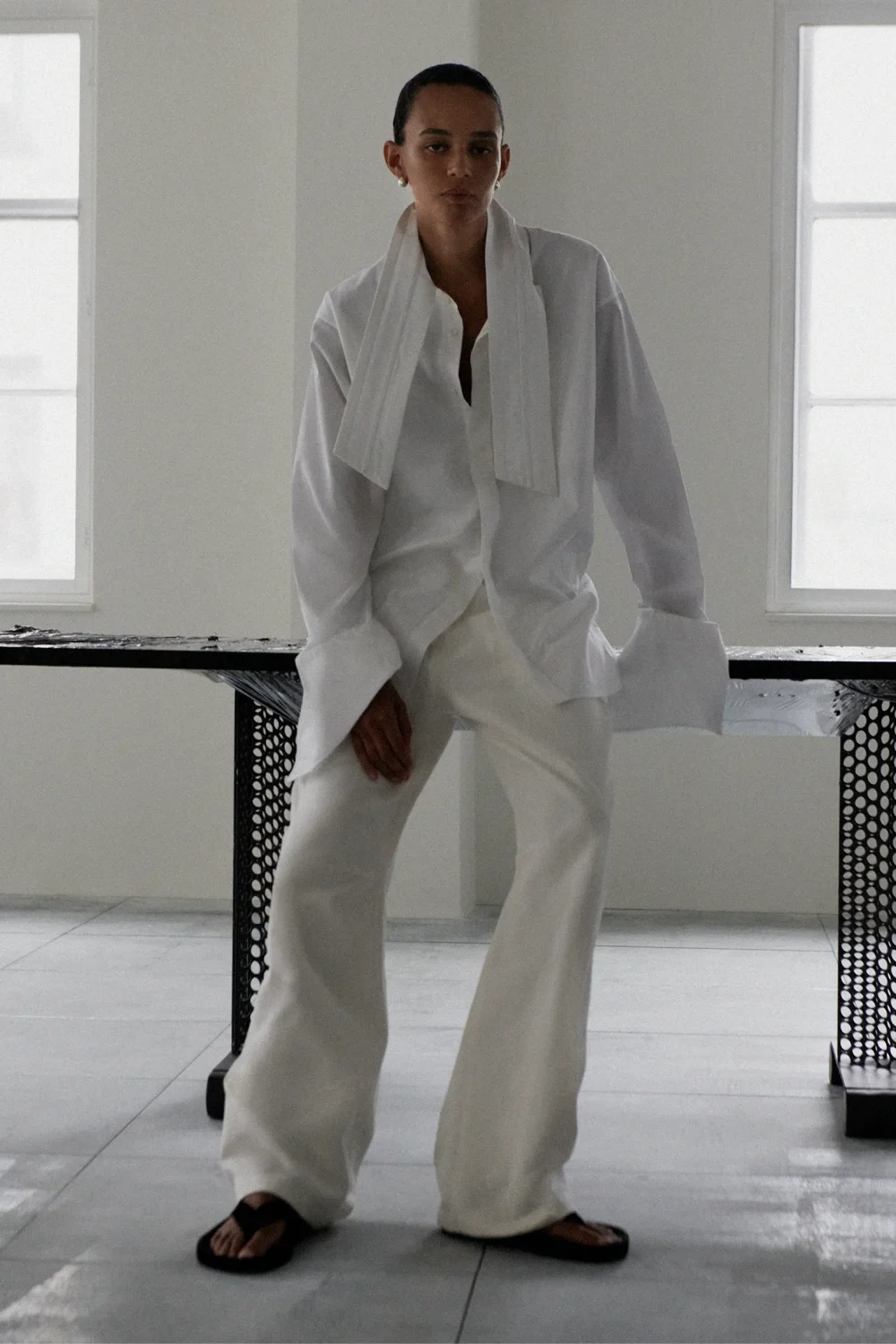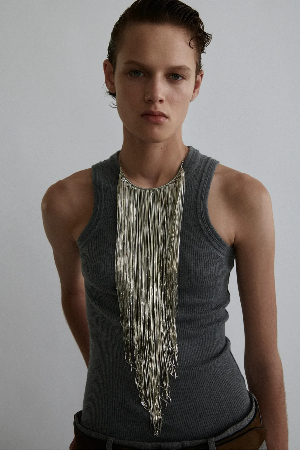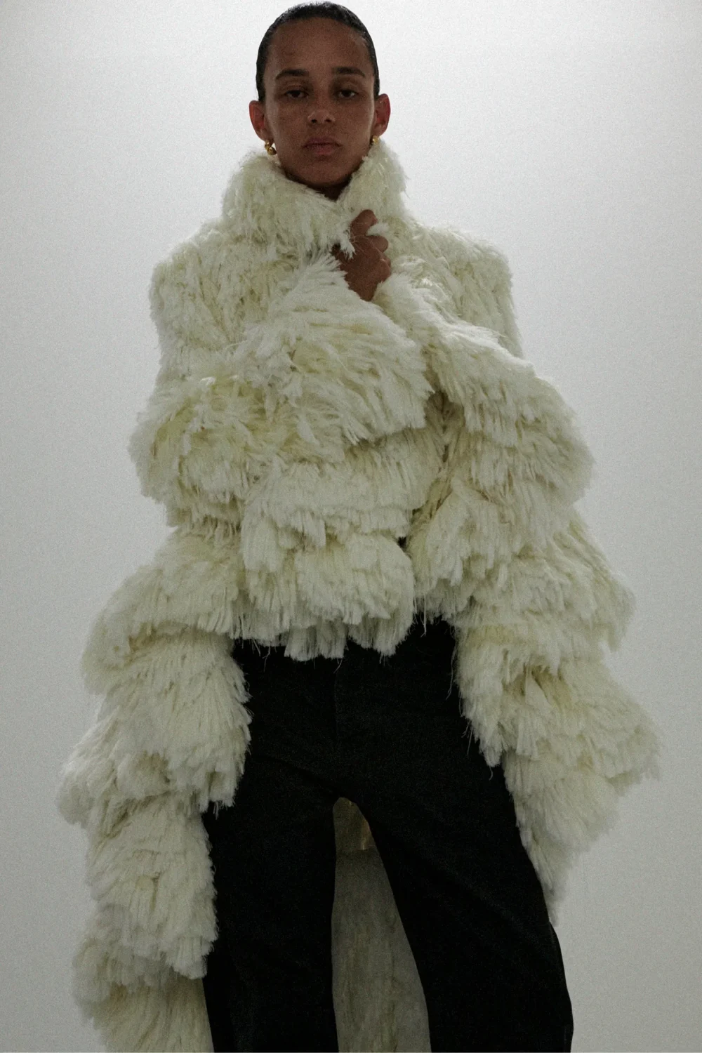 В коллекции также представлены футболки, выполненные из плотного японского хлопка и украшенные изображениями ключевых элементов первой коллекции, таких как блестящее платье или модель Бинкс Уолтон в очках Peak, а также шарфы-подушки, массивные шлепанцы и эксцентричные туфли на высоком каблуке. Отдельного внимания заслуживает шуба с пропорциями 40-х годов, навевающая мысли о звездах старого Голливуда, и объемная брошь из нейлона, приколотая на плечи пальто и плащей.