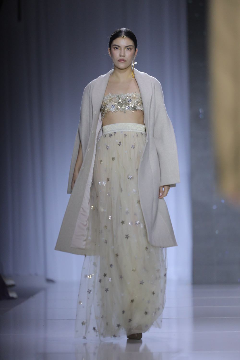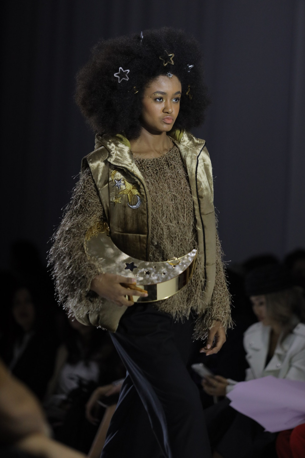 Космическое настроение было представлено с помощью звездной россыпи, изображений Луны и Солнца. Жилетки из бархата и длинные накидки, oversize-пиджаки и воздушные юбки — необыкновенная вышивка ручной работы искусно расположилась на изделиях. Также нельзя не отметить и стильные головные уборы, к которым дизайнеры предлагают обратиться в этом сезоне. Судя по всему, пора попрощаться с шапками-бини и сделать ставку на косынки и чепчики.