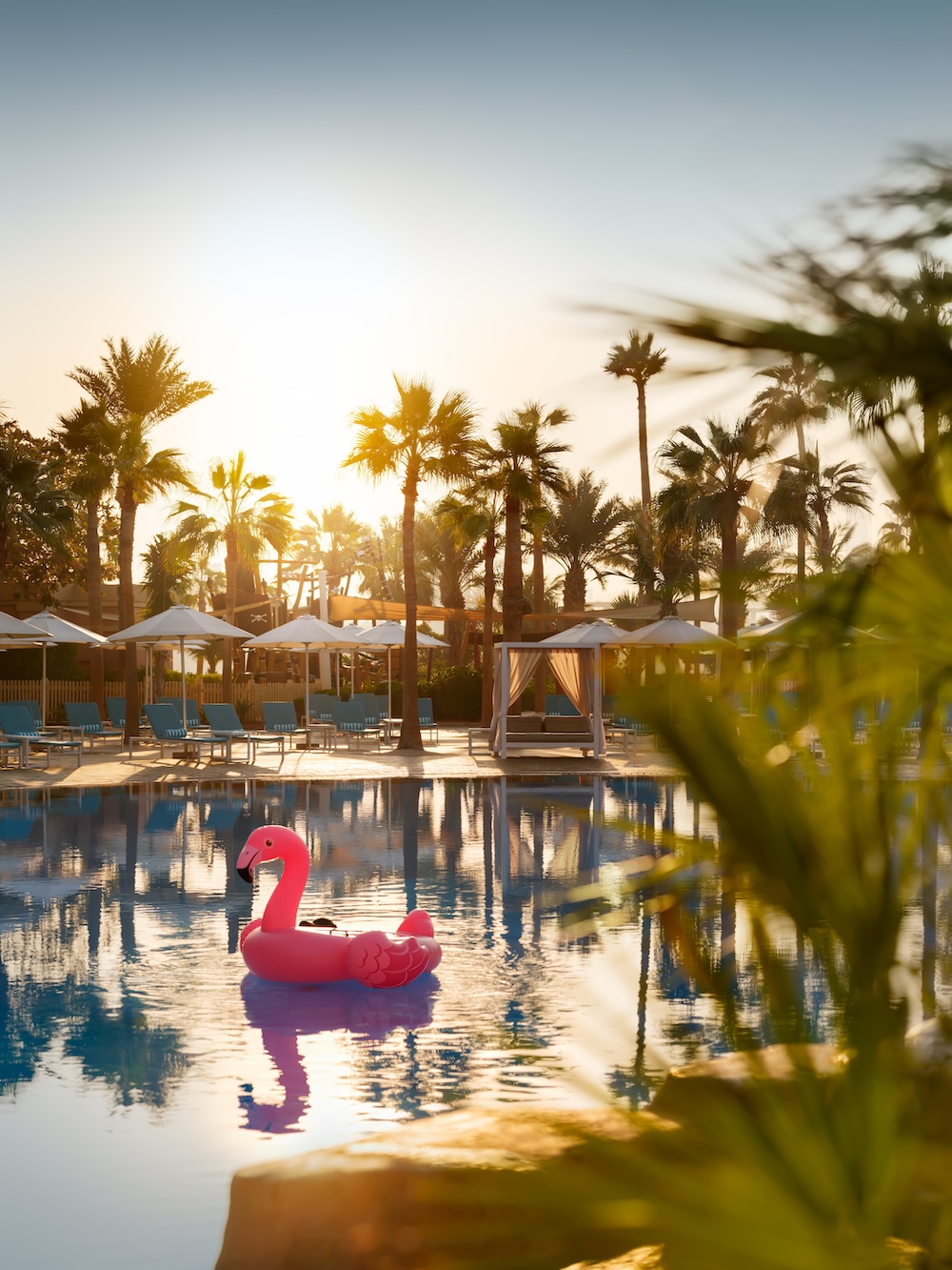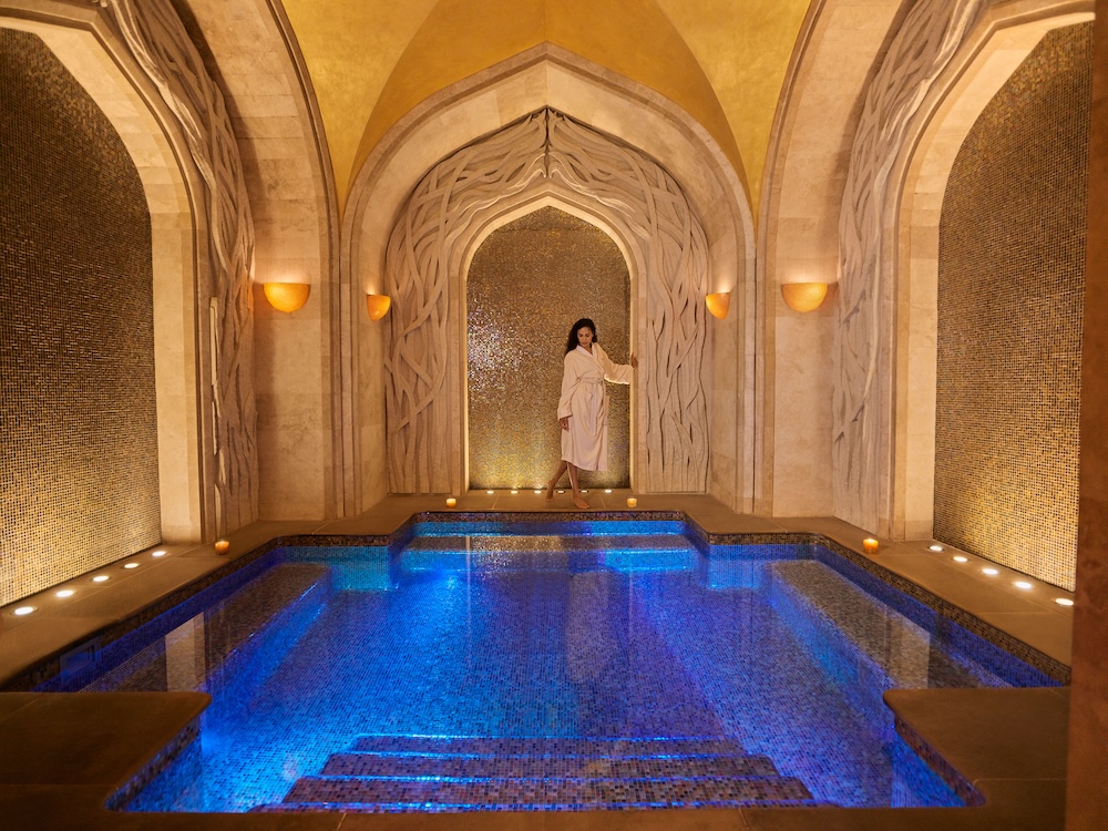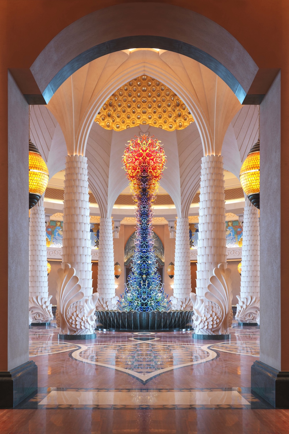 Величественная кораллово-розовая архитектура курорта вдохновлена ближневосточным стилем и легендами об Атлантиде. Уникальные детали — ручная ковка, колонны в виде пальм, светильники из цветного стекла — создают ощущение настоящей сказки. Панорамные окна лобби открывают завораживающий вид на воды Аравийского моря.