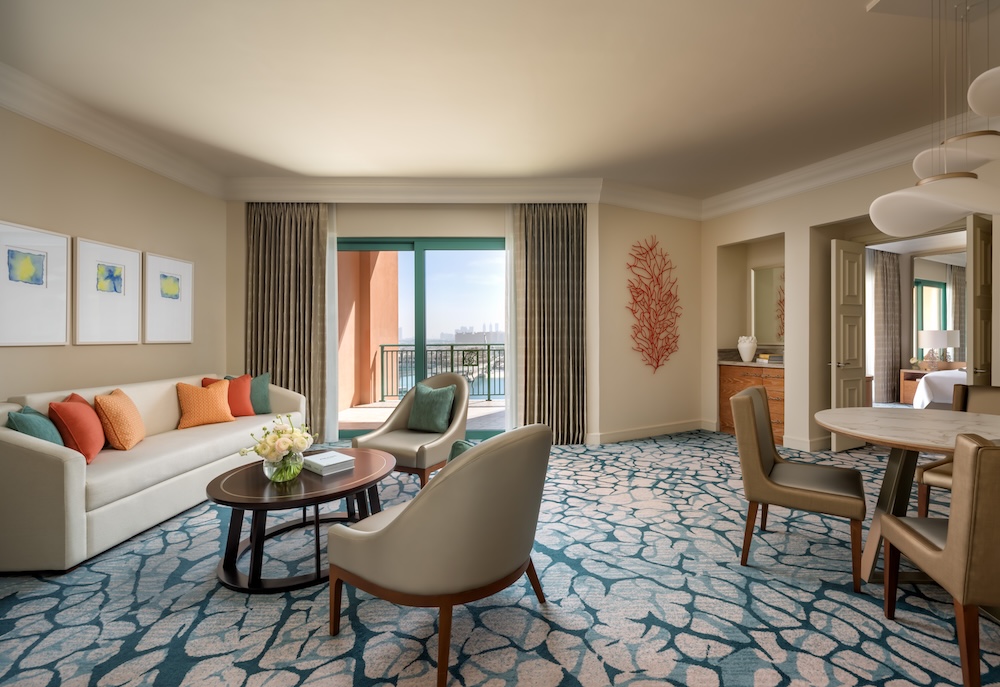 Atlantis, The Palm предлагает выбор из 1544 просторных номеров, включая подводные люксы и номера с панорамным видом на остров Палм-Джумейра. Интерьеры оформлены в природных тонах с морскими акцентами. Ванные комнаты — как из фильмов: мрамор, тропический душ, двойные раковины. Для особого уровня комфорта рекомендуется формат размещения Imperial Club с отдельной зоной регистрации, лаунджем с напитками, закусками и привилегиями для всей семьи.