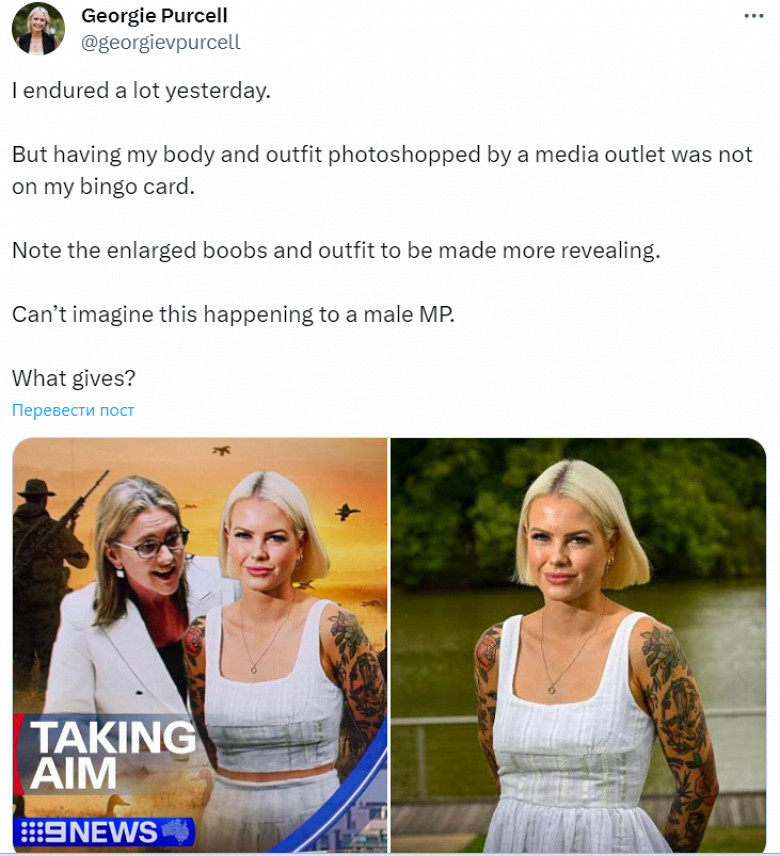 Австралийский канал Nine News оказался в центре скандала из-за публикации видоизмененной фотографии самой молодой депутатки парламента штата Виктория Джорджи Перселл. В эфире был показан сюжет, в котором политик раскритиковала местные власти за отмену запрета охотиться на уток. Сотрудники канала прикрепили к материалу обработанную фотографию Перселл, где ей оголили живот и увеличили грудь.