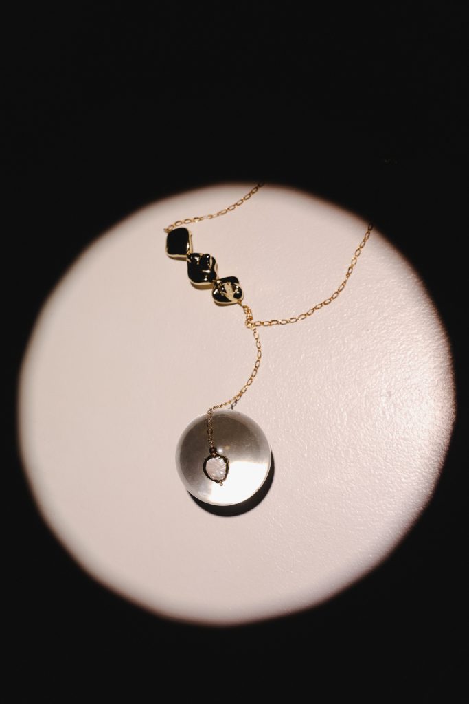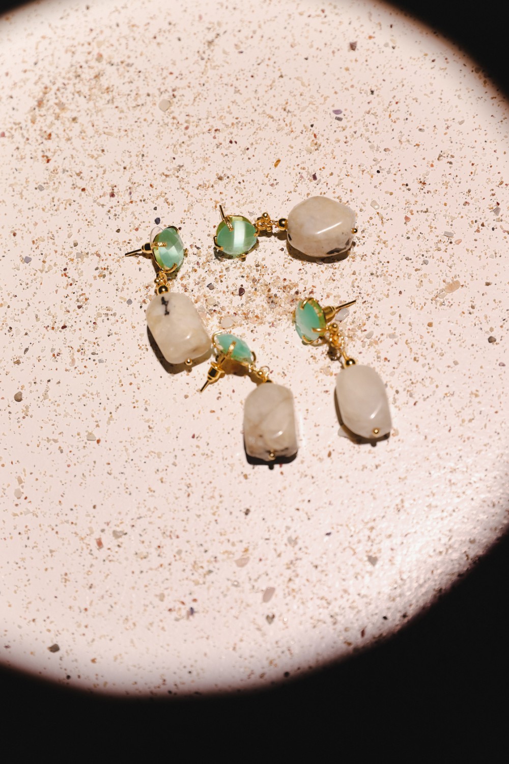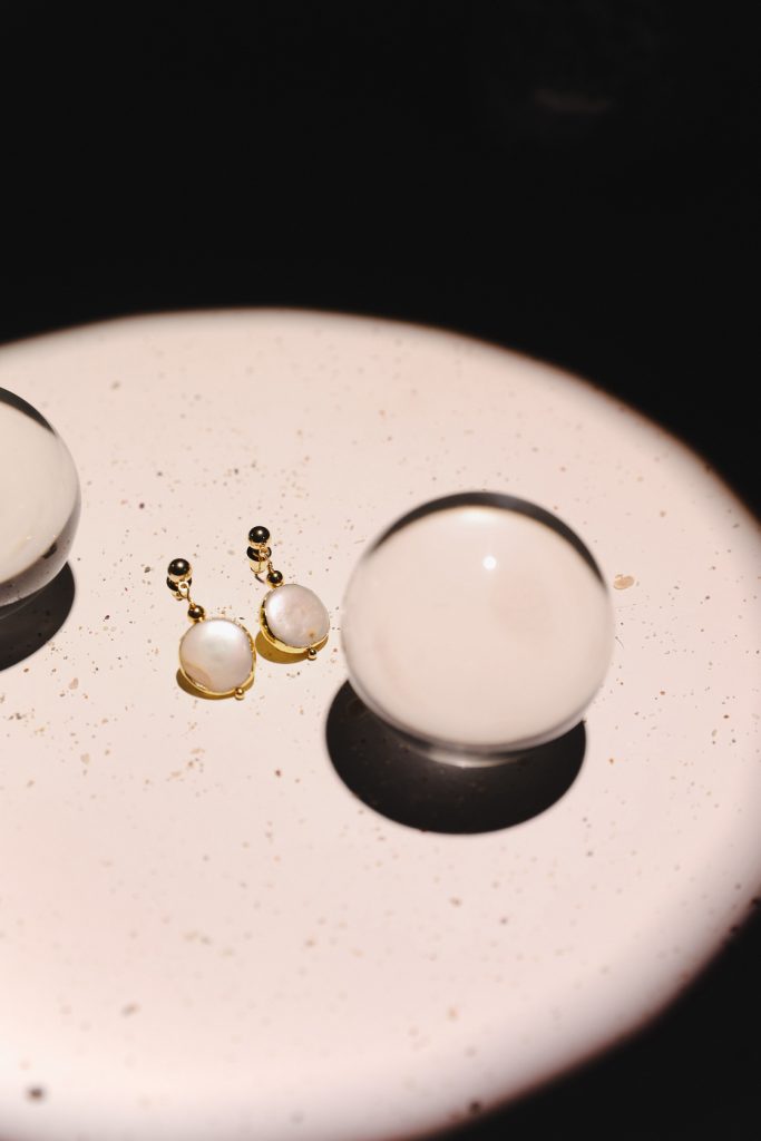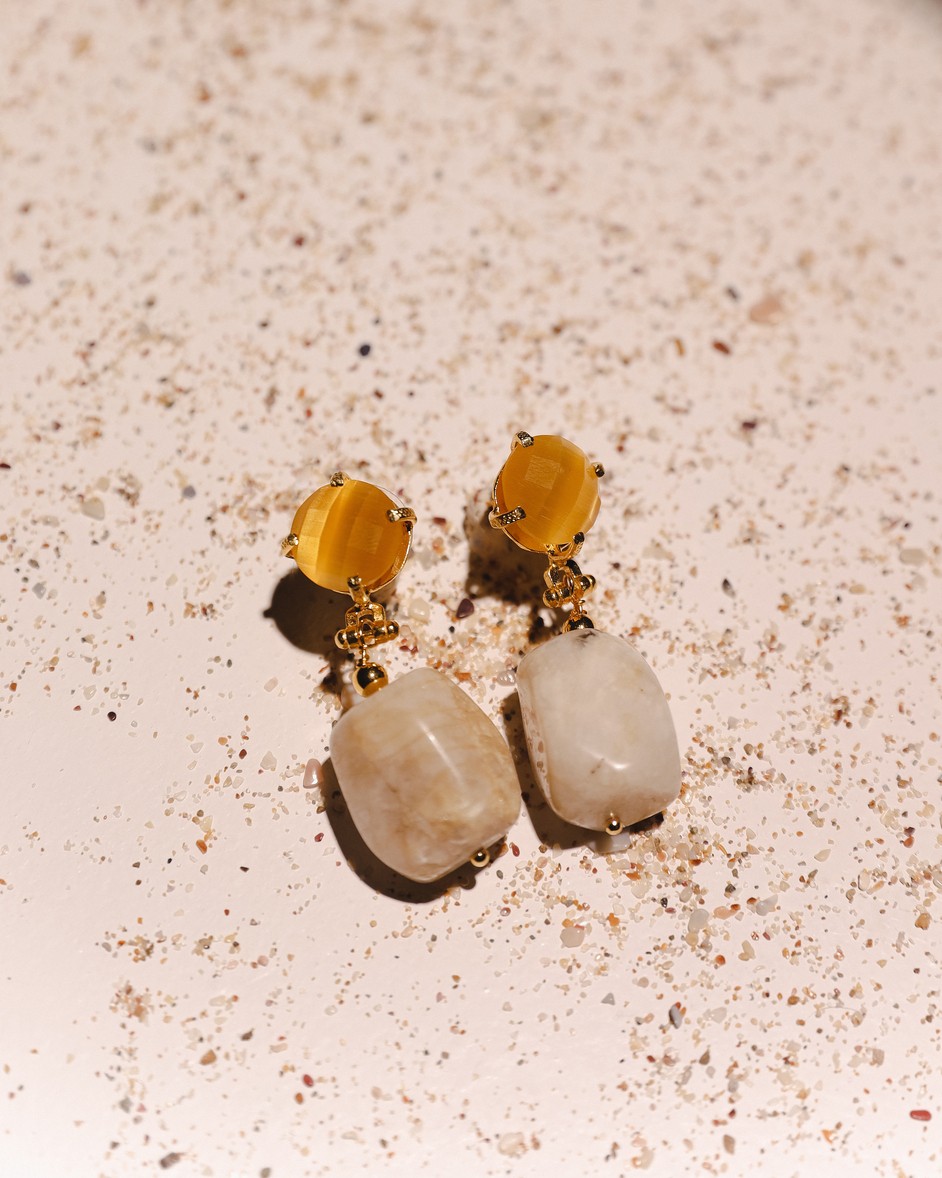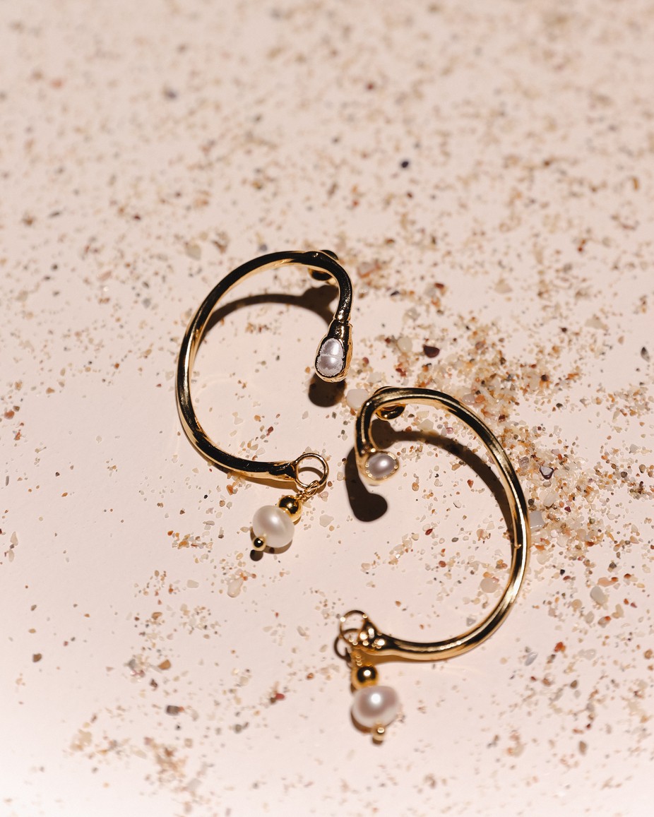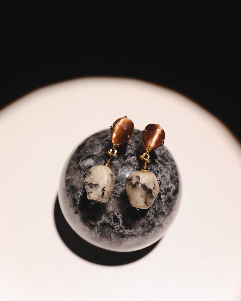 Дизайнеры Анастасия Рябоконь и Олеся Кононова создали лаконичные моносерьги и пины-подвесы, а также яркие украшения в стиле барокко с элементами из лунного камня и камня кошачий глаз. Ряд изделий также дополнен натуральным жемчугом разных оттенков и форм, а все элементы фурнитуры покрыты позолотой.