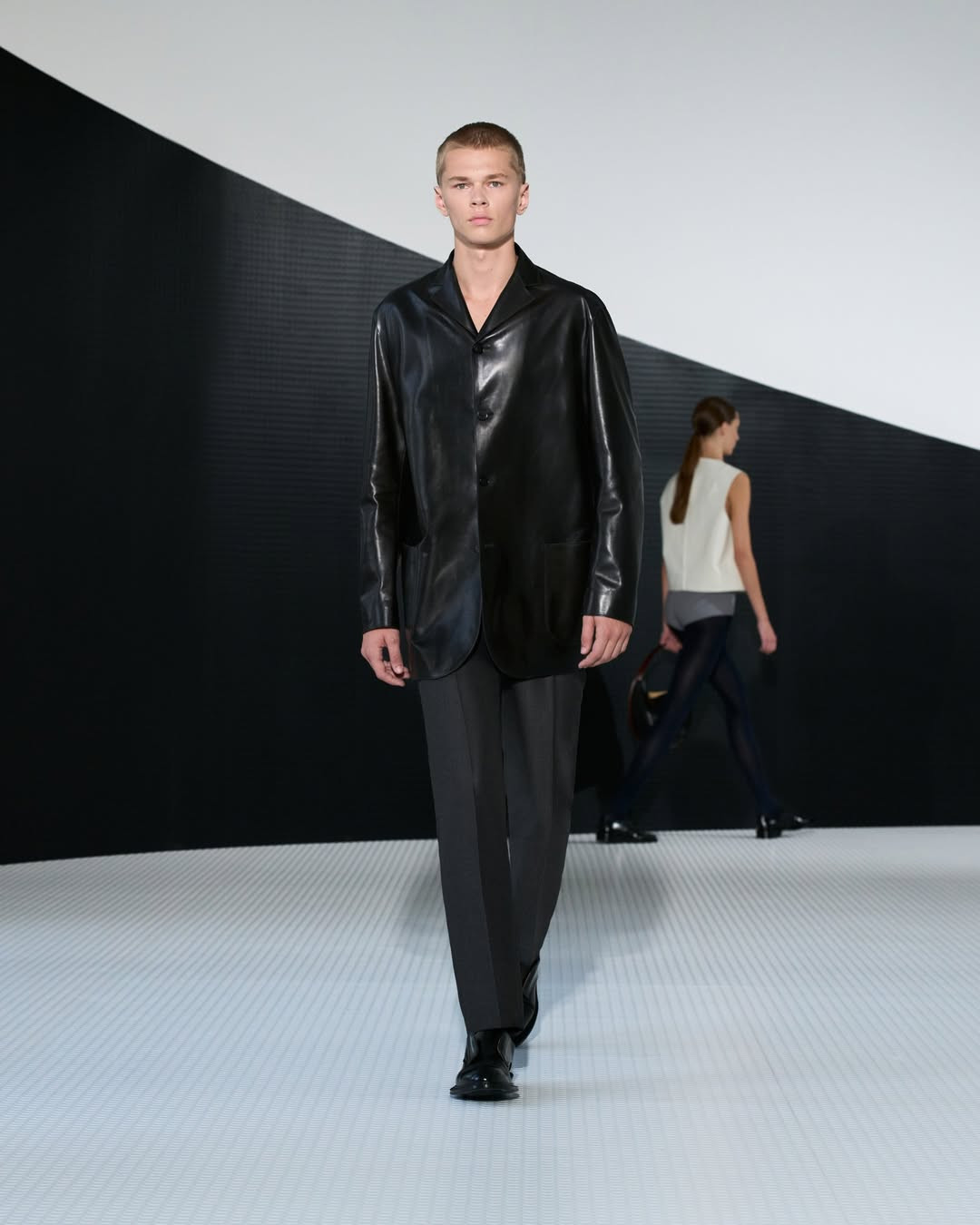 Шоу открыло появление Женевье Ван Синус — модели, чье лицо в 90-е олицетворяло эстетику Jil Sander. Она предстала в укороченном темно-синем свитере, белой карандаш-юбке с четкими вытачками от бедра и блестящих оксфордах. Образ получился свежим и до боли узнаваемым — таким, с которого началась история Jil Sander. Дальше Беллотти позволил себе играть с формой и фактурой. Минимализм оставался строгим, но уже не столь холодным. Слои из технической тафты превращались в юбки и платья, которые мягко колыхались при движении. А плащи и тренчи из этого материала выглядели как архитектурные конструкции.