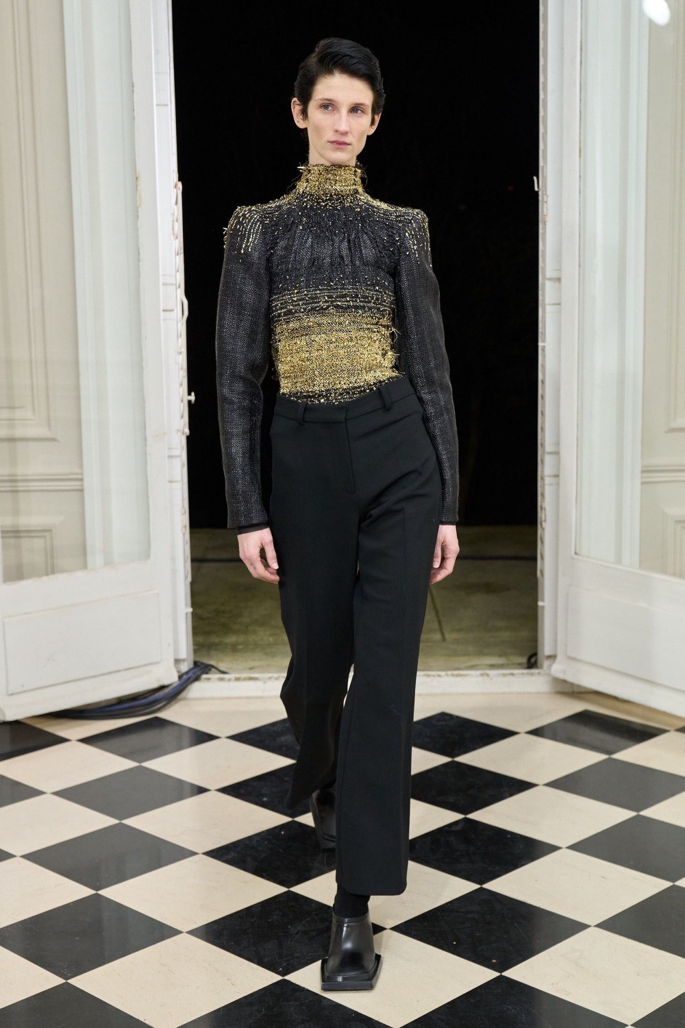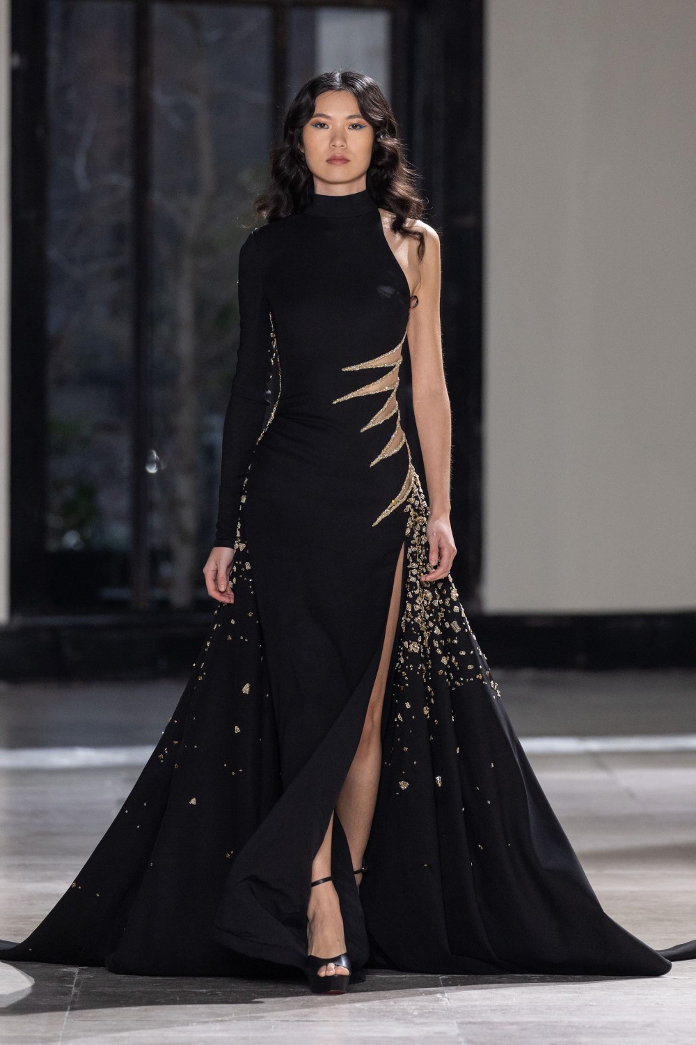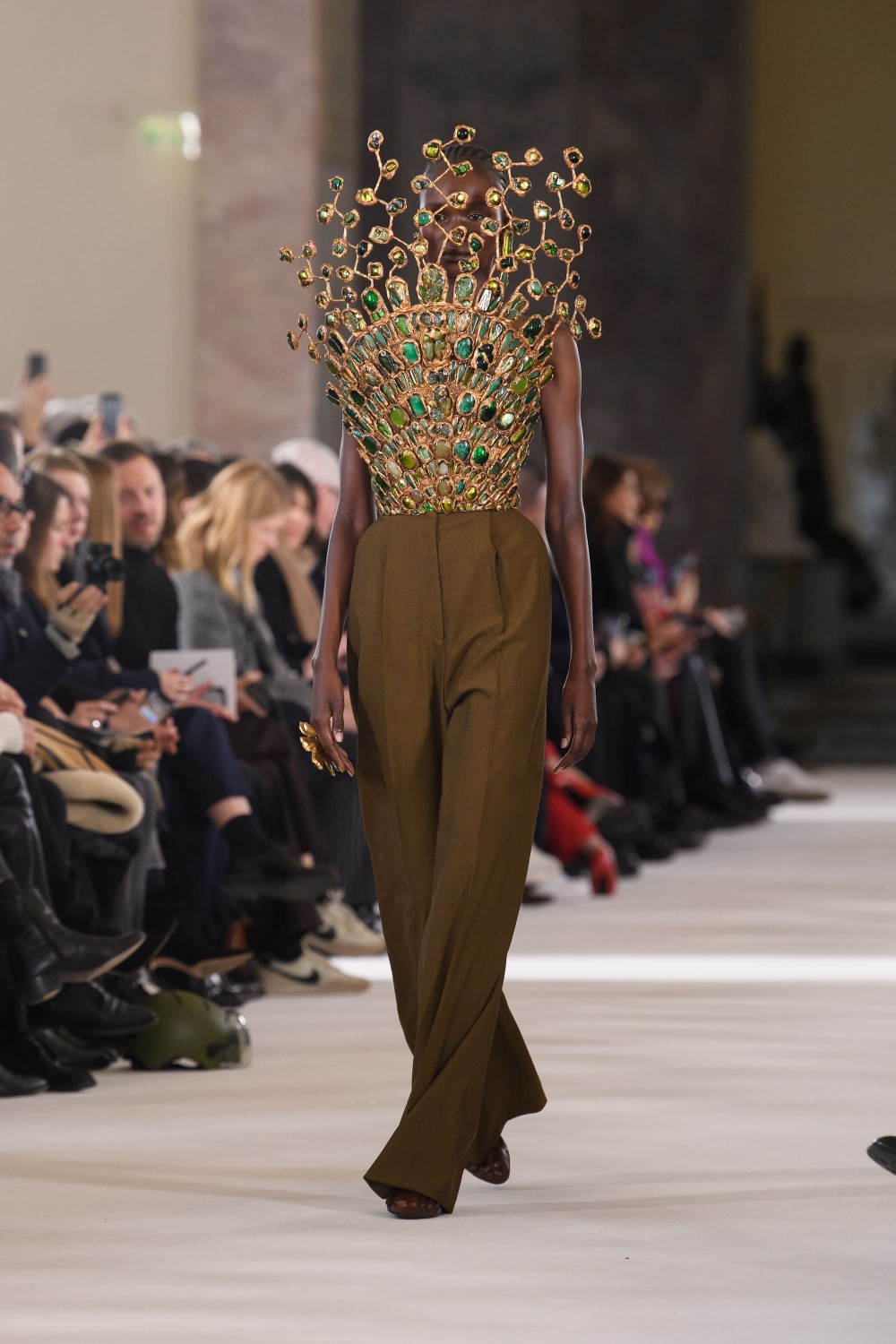 Силуэты в нарядах отражают ощущение легкости, мастерства и современности — платья словно «плывут» по телу. «Замерзшие» капли воды, каскадные ромбовидные формы и эфирный взрыв перьев, что словно развеваются, — изобилие вышивки создает волшебный эффект. Цветовая палитра по-настоящему яркая: она включает в себя оттенки желтого, розового и голубого наряду с классическими черным и белым. Сочетания изысканно играют на контрастах. Да, мужская мода снова на подиуме Georges Hobeika — она возвращает себе место в ДНК модного дома.
