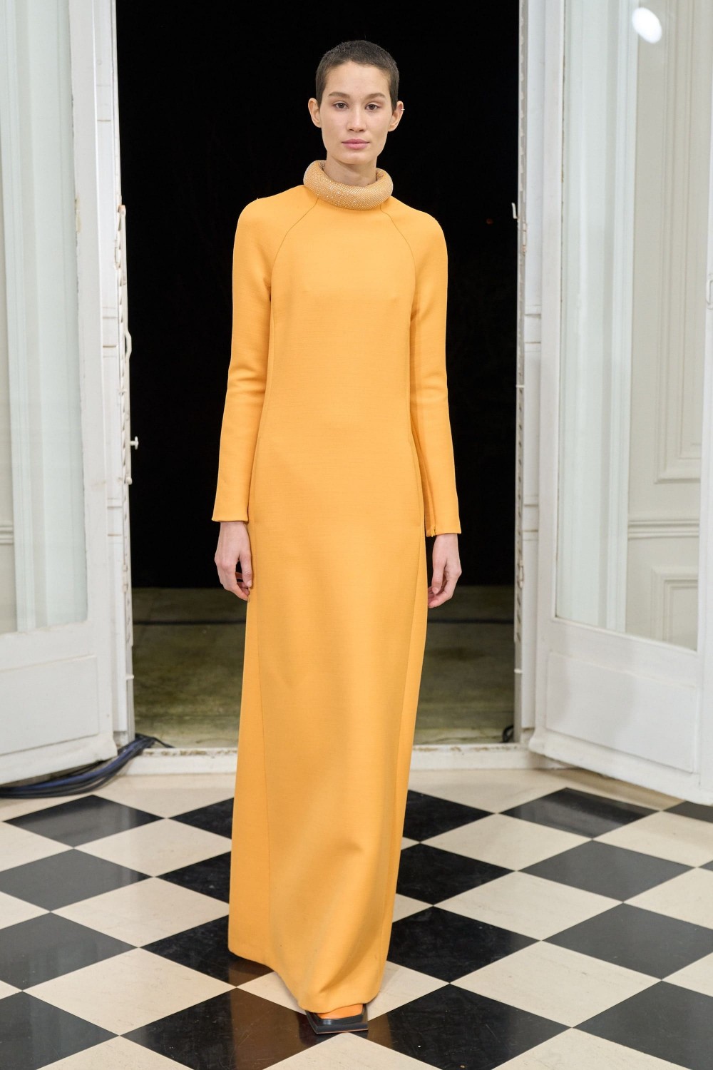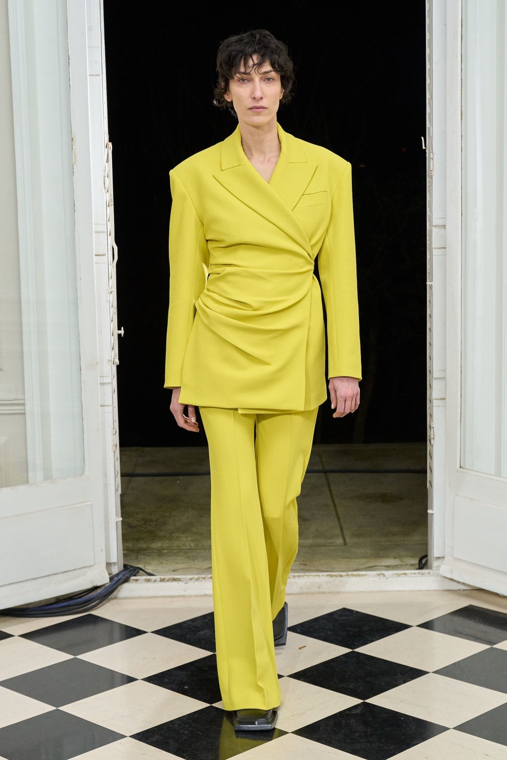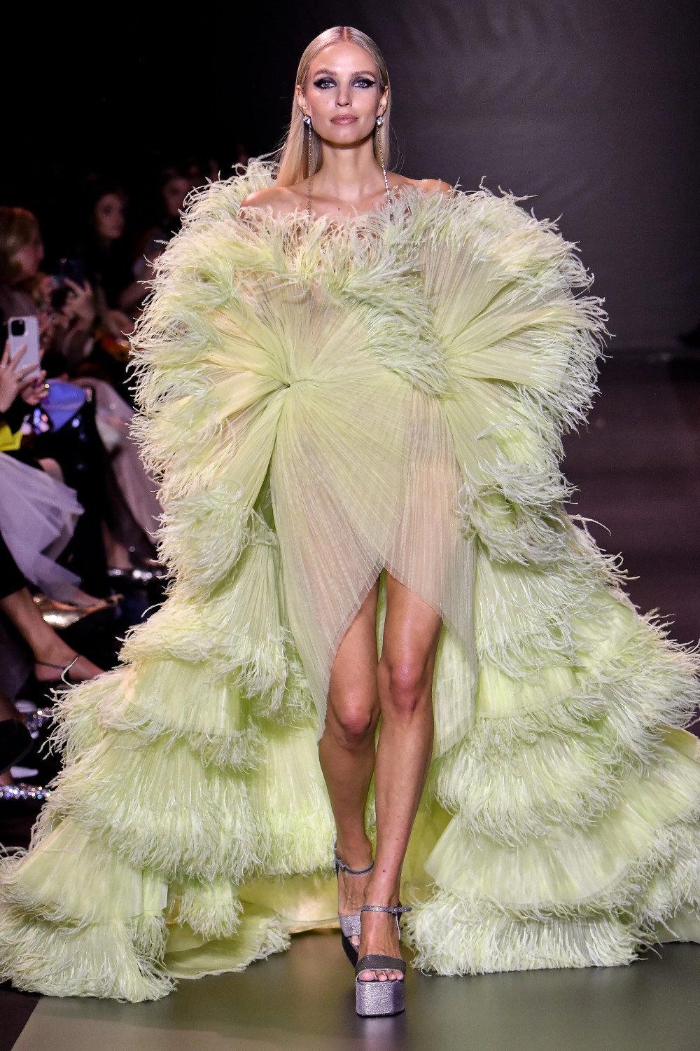 Силуэты в нарядах отражают ощущение легкости, мастерства и современности — платья словно «плывут» по телу. «Замерзшие» капли воды, каскадные ромбовидные формы и эфирный взрыв перьев, что словно развеваются, — изобилие вышивки создает волшебный эффект. Цветовая палитра по-настоящему яркая: она включает в себя оттенки желтого, розового и голубого наряду с классическими черным и белым. Сочетания изысканно играют на контрастах. Да, мужская мода снова на подиуме Georges Hobeika — она возвращает себе место в ДНК модного дома.