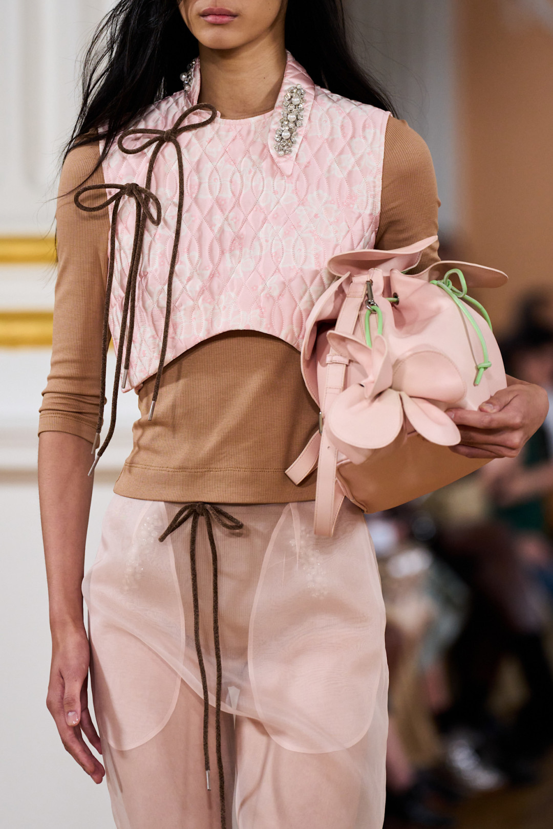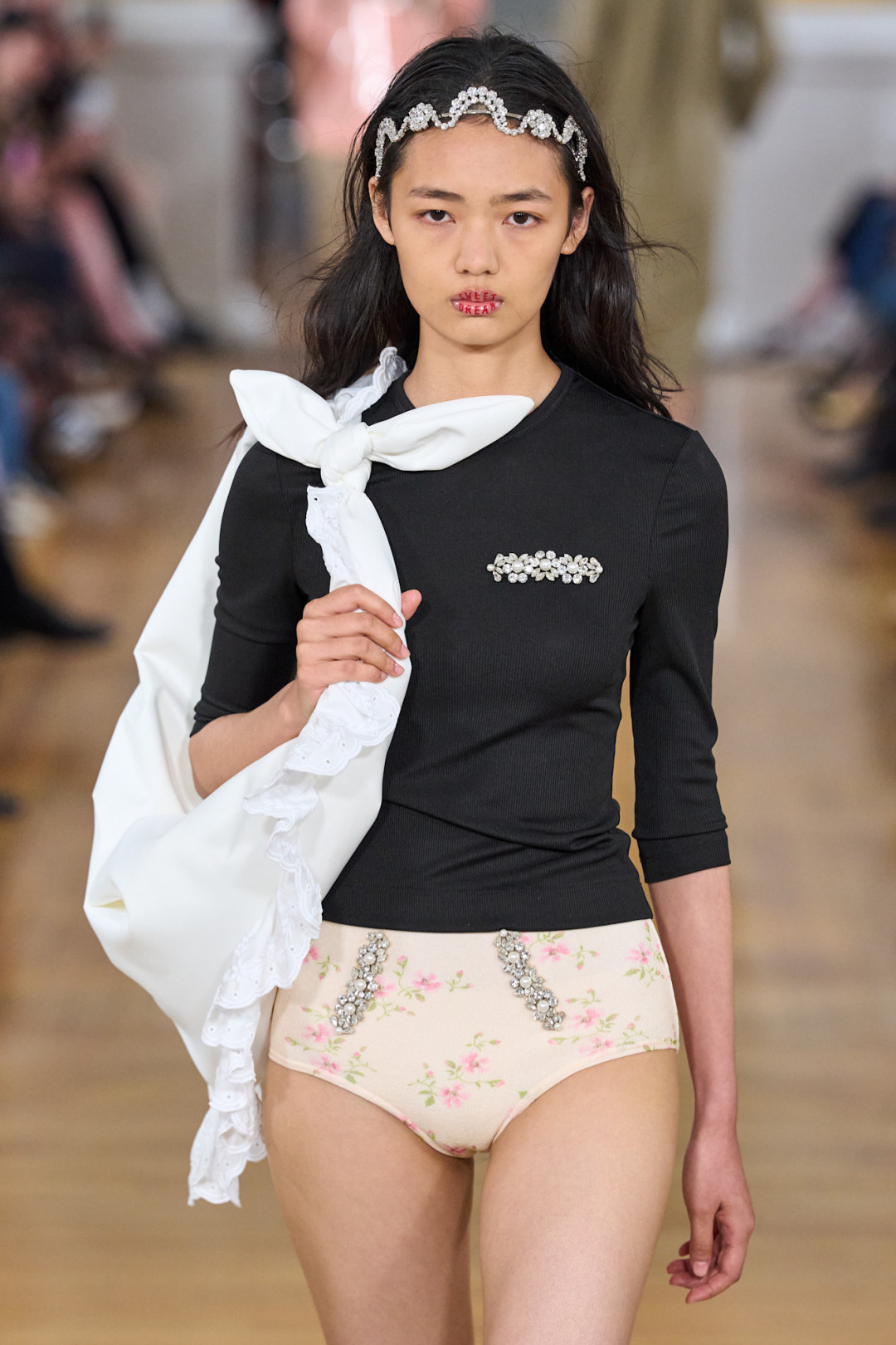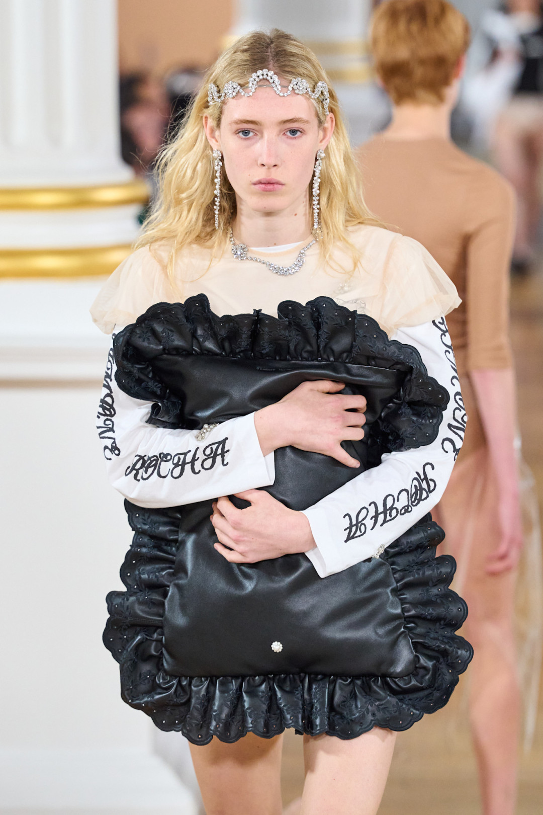 Коллекция открылась полупрозрачной юбкой из органзы поверх кринолина и блестящим бралеттом, который, казалось, готов сорваться с плеча. Мгновенная ассоциация — первая школьная дискотека, где все немного не в своей тарелке. Сопутствующие детали — тиары, асимметричные ожерелья, сумки в виде мягких подушек — усиливали это ощущение игры «в примерочную». Модели пожимали плечами, обнимали свои аксессуары, а макияж выглядел слегка смазанным — словно после первых слез из-за неудачного танца.