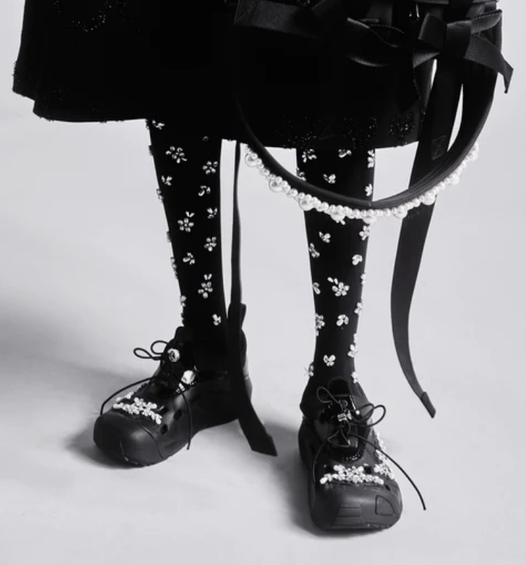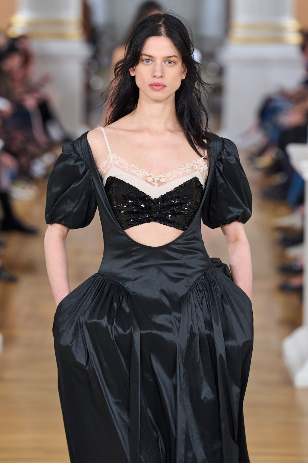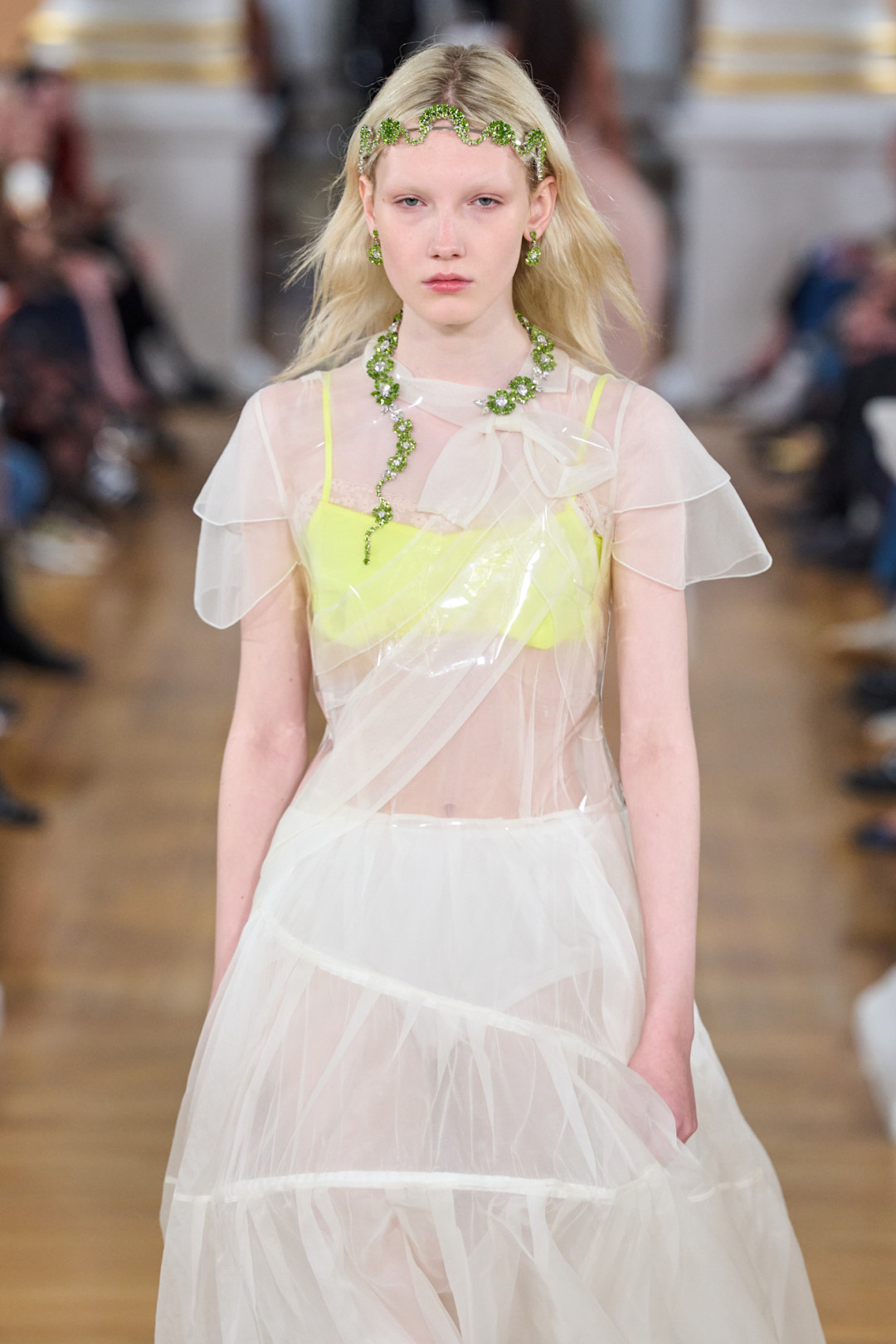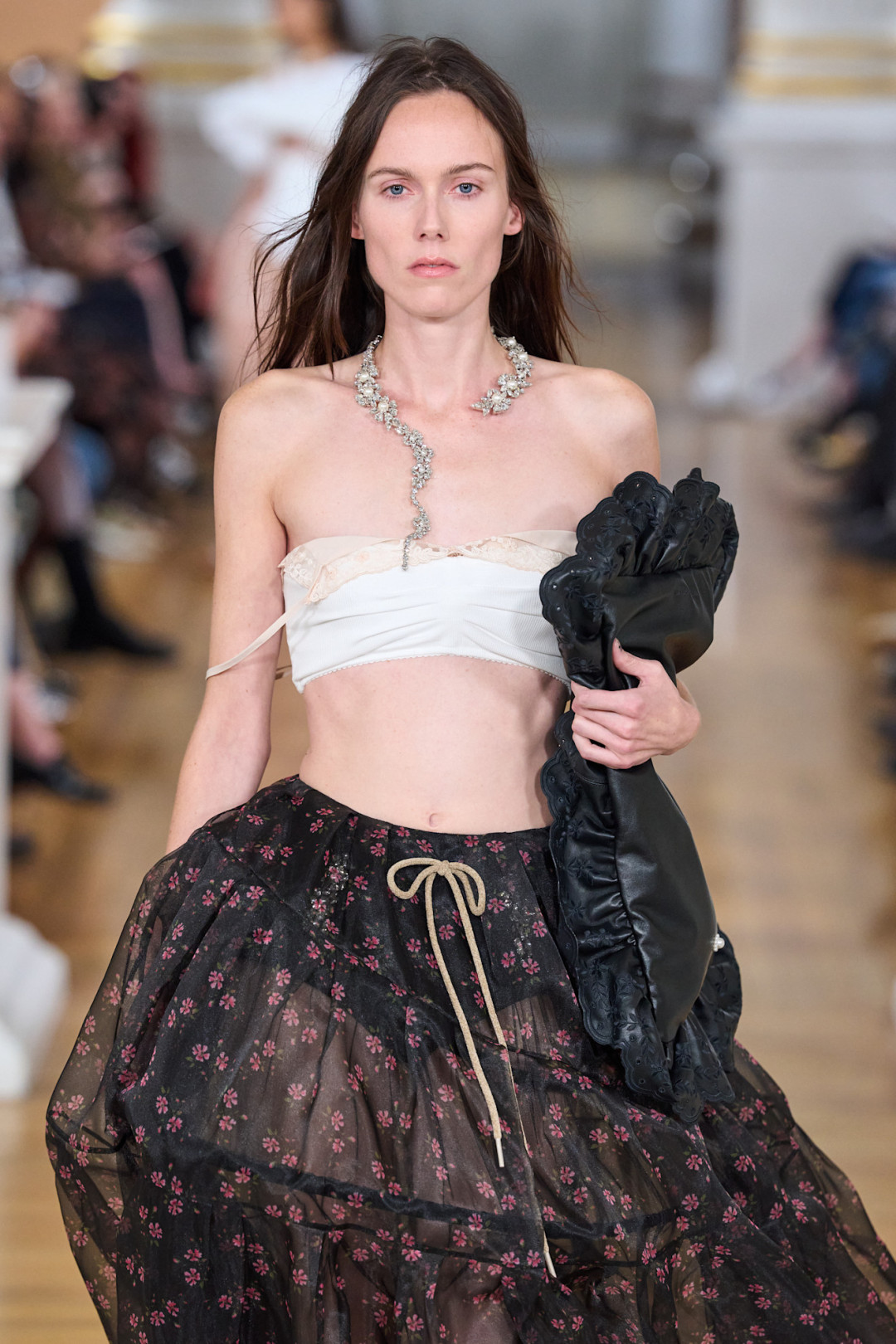 Коллекция открылась полупрозрачной юбкой из органзы поверх кринолина и блестящим бралеттом, который, казалось, готов сорваться с плеча. Мгновенная ассоциация — первая школьная дискотека, где все немного не в своей тарелке. Сопутствующие детали — тиары, асимметричные ожерелья, сумки в виде мягких подушек — усиливали это ощущение игры «в примерочную». Модели пожимали плечами, обнимали свои аксессуары, а макияж выглядел слегка смазанным — словно после первых слез из-за неудачного танца.