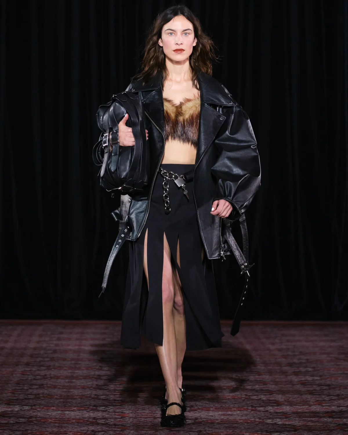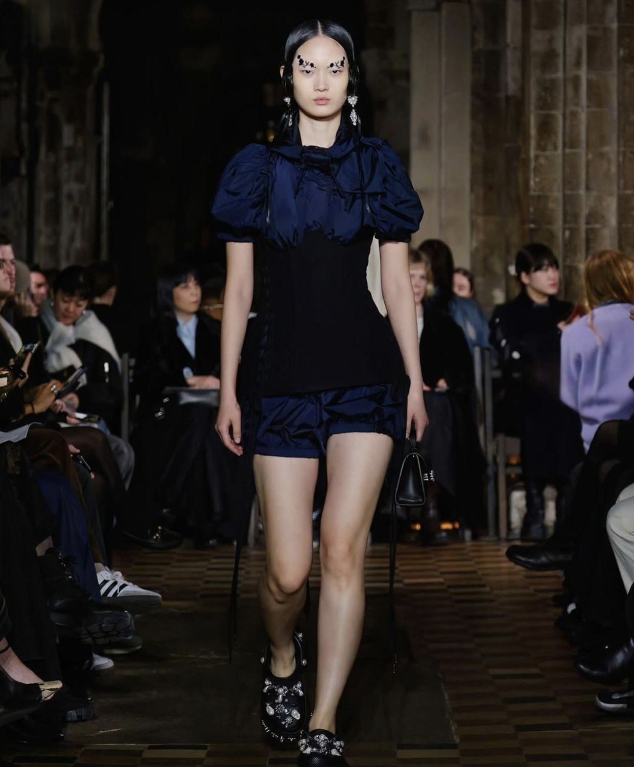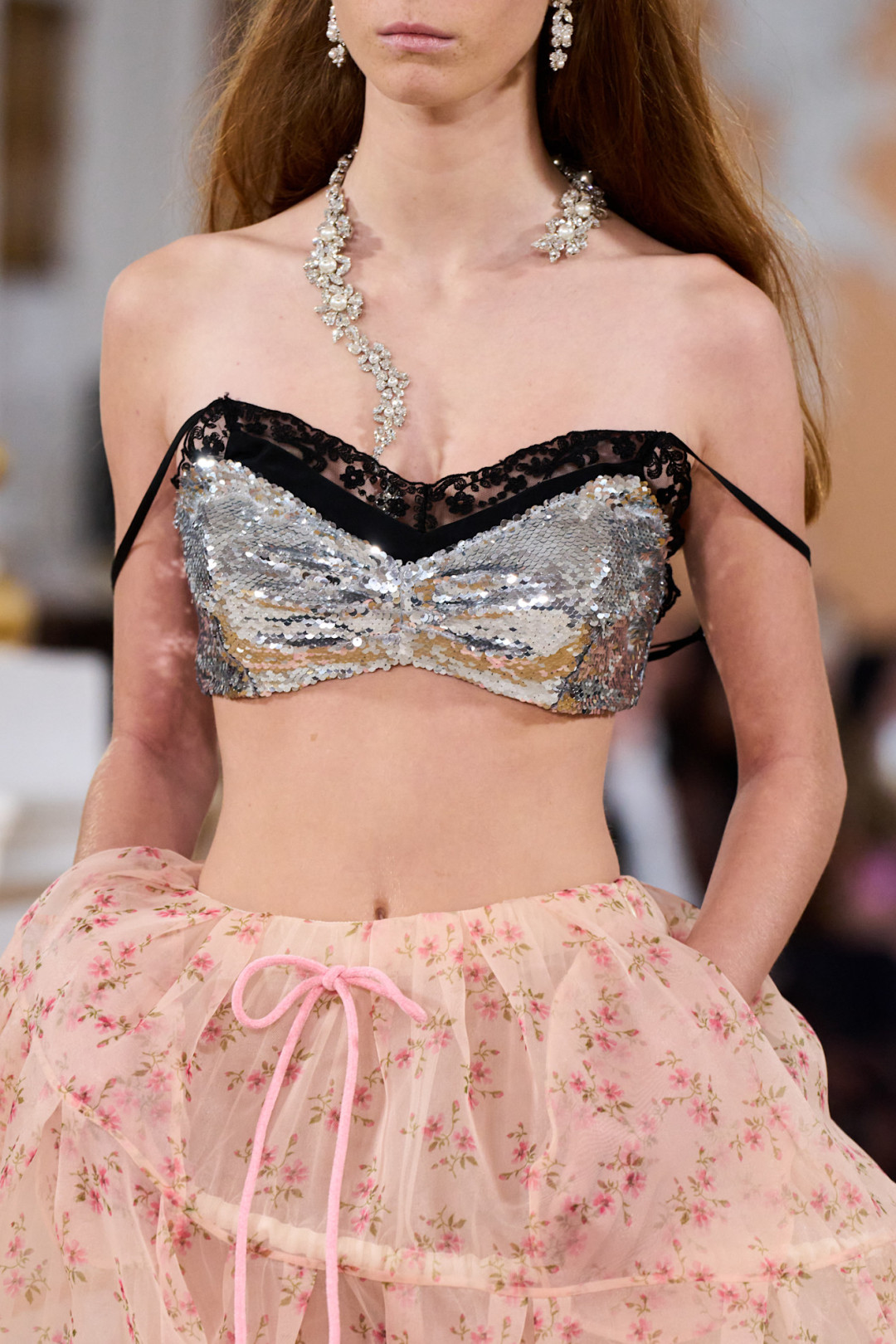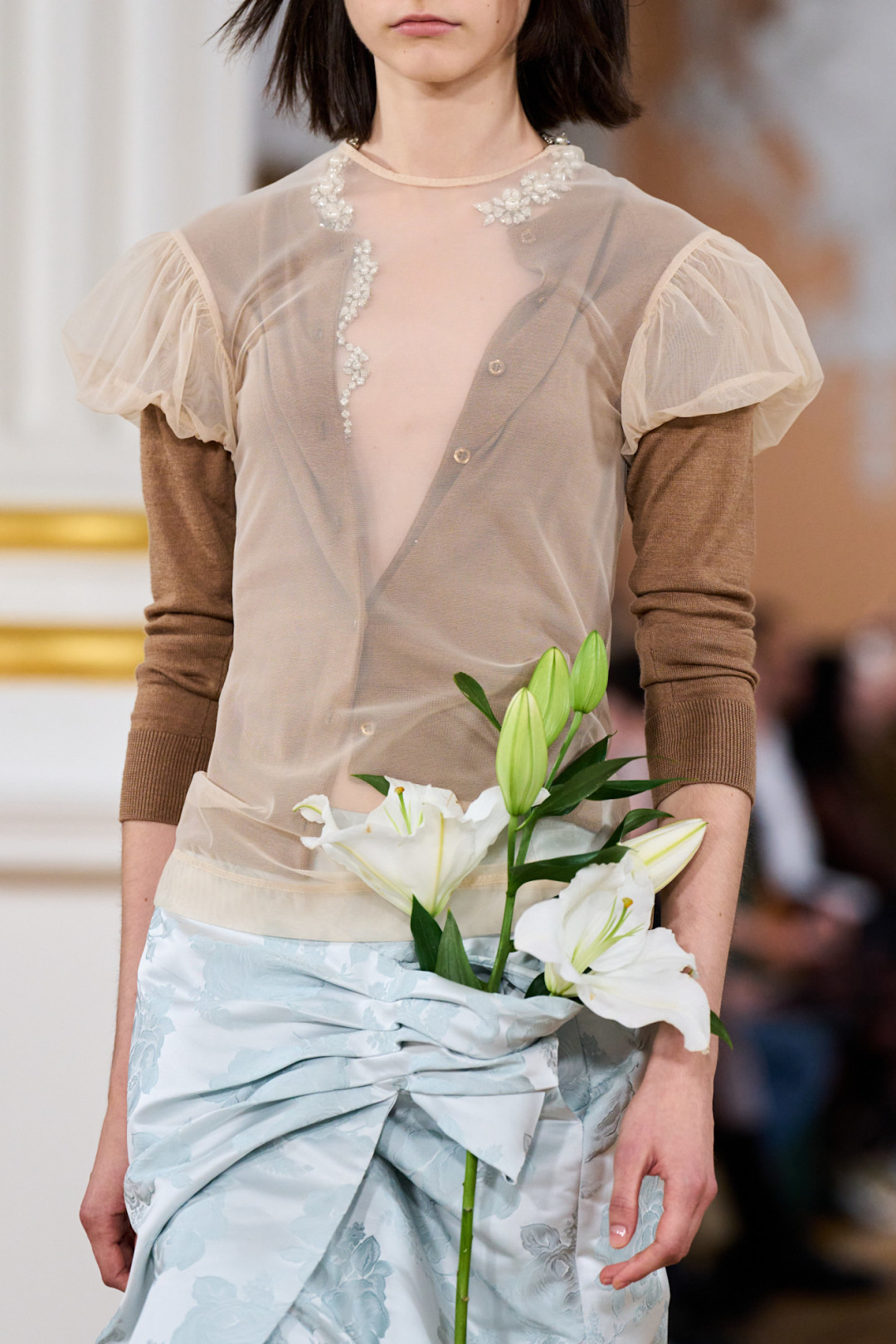 Коллекция открылась полупрозрачной юбкой из органзы поверх кринолина и блестящим бралеттом, который, казалось, готов сорваться с плеча. Мгновенная ассоциация — первая школьная дискотека, где все немного не в своей тарелке. Сопутствующие детали — тиары, асимметричные ожерелья, сумки в виде мягких подушек — усиливали это ощущение игры «в примерочную». Модели пожимали плечами, обнимали свои аксессуары, а макияж выглядел слегка смазанным — словно после первых слез из-за неудачного танца.