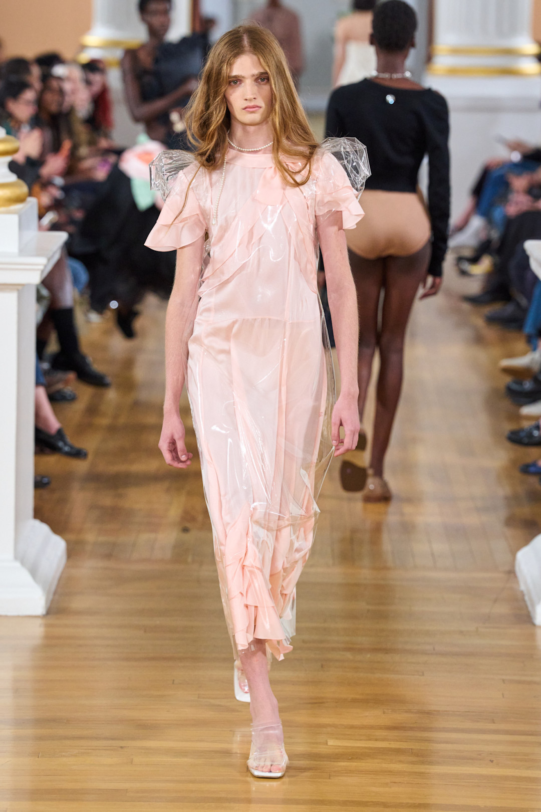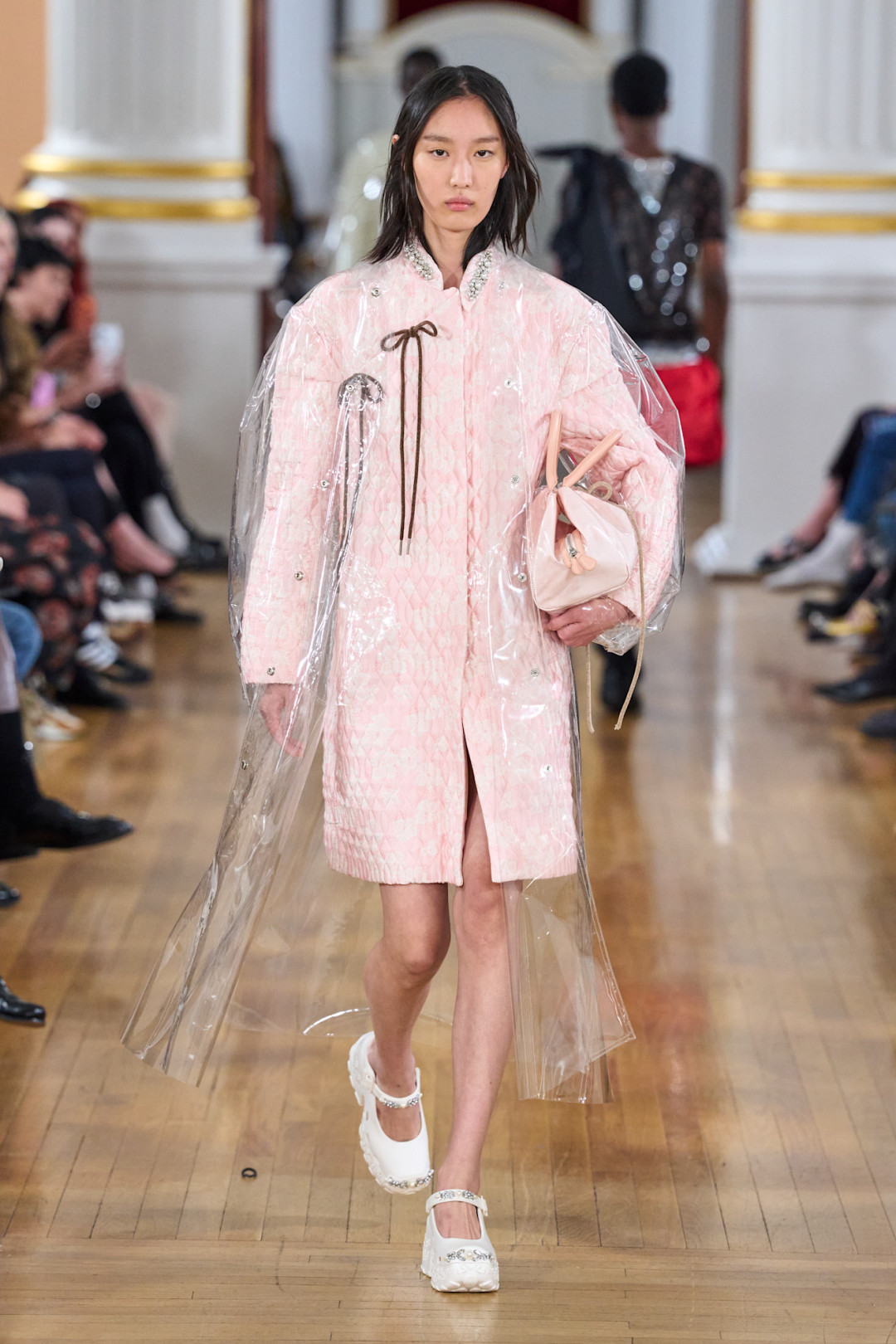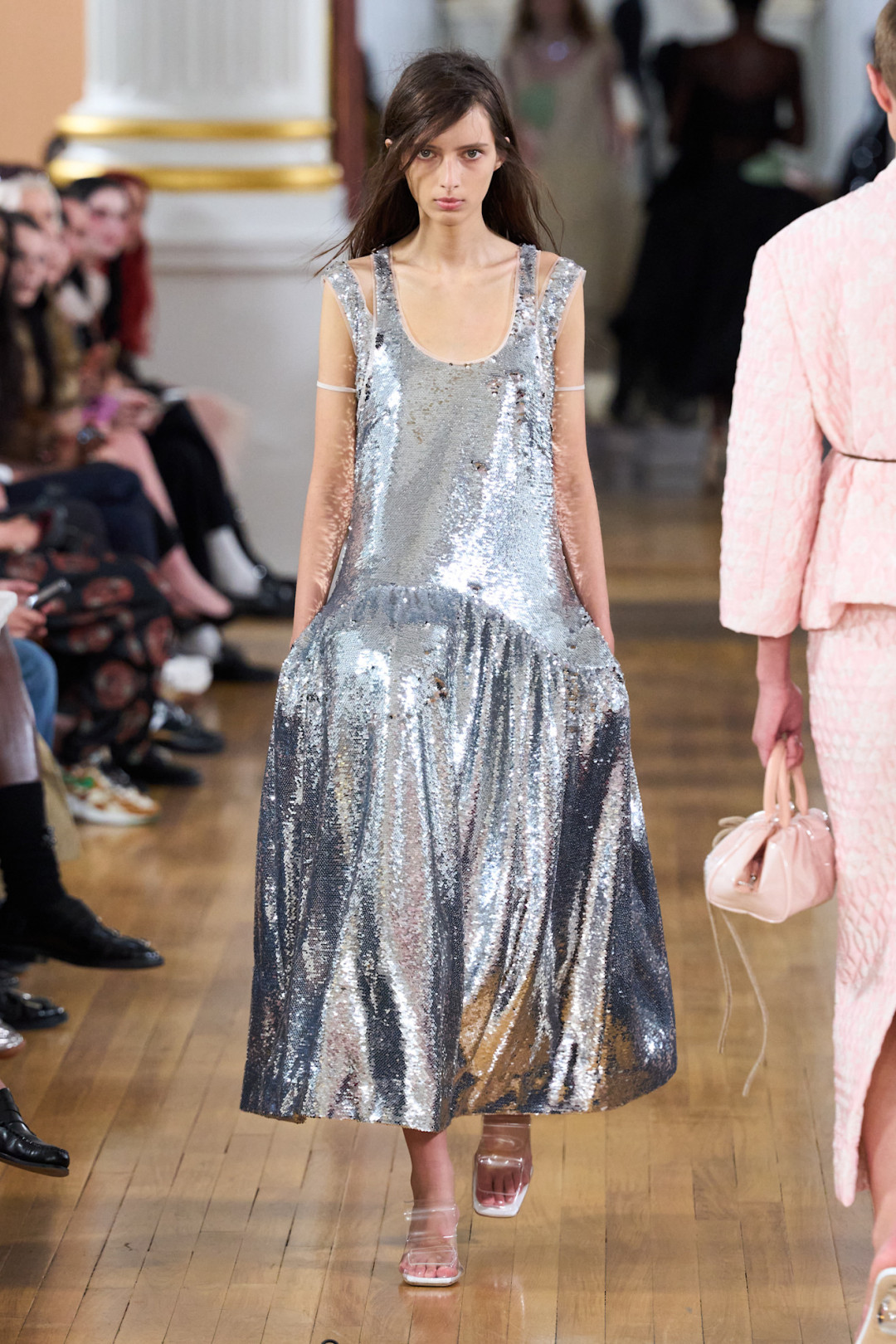 От зала уголовного суда до корабля на Темзе — Симон Роша умеет выбирать локации для показов так, что они сами становятся частью нарратива. На этот раз дизайнер пригласила гостей в Mansion House — резиденцию лорд-мэра Лондона XVIII века. Канделябры, позолоченные потолки и атмосфера старого Лондона сделали пространство идеальной сценой для новой главы — коллекции, которую сама дизайнер назвала «момент неловкости».