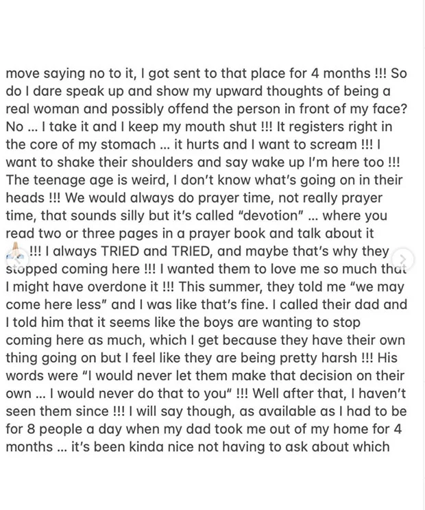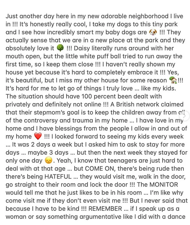 И Бритни Спирс не намерена молчать - она опубликовала пост, в котором рассказала о взаимоотношениях с сыновьями. По ее словам, они ведут себя "враждебно" во время визитов к ней домой.