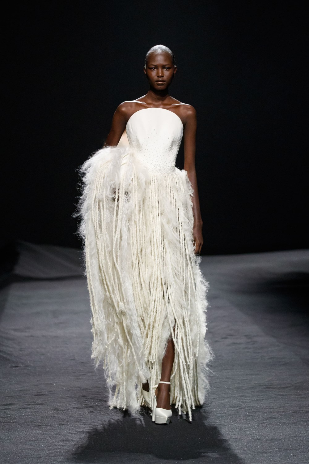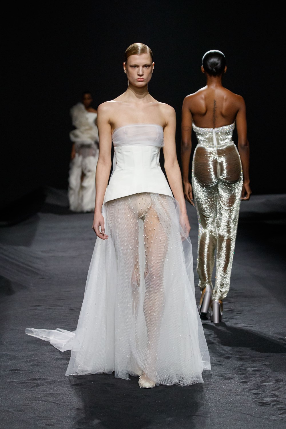 Чувственная и утонченная коллекция от Zahuir Murad вдохновлена замками Belle-Époque на Французской Ривьере. Наряды из кади, тюля, шифона, тафты и атласа дополнены драпировкой и вышивкой, воспроизводящей архитектурные детали эпохи. Затемненная палитра сочетает в себе цвета заходящего солнца на море: нежно-розовый, ярко-розовый, огненно-оранжевый, бледно-зеленый, синий, бледно-желтый. Бахрома, сборки на талии, встроенные вуали, украшения на голову и потоки кристаллов — дух бурных двадцатых вернулся в показе Zuhair Murad.