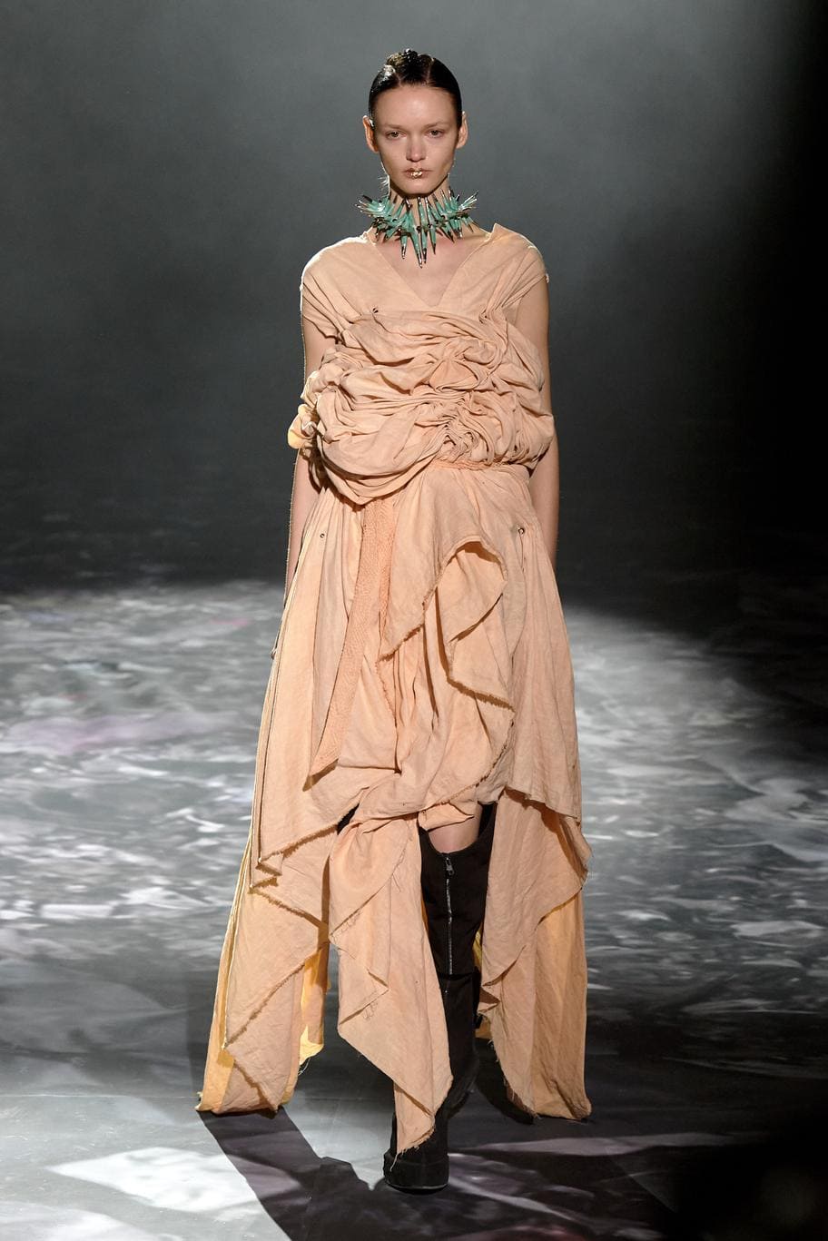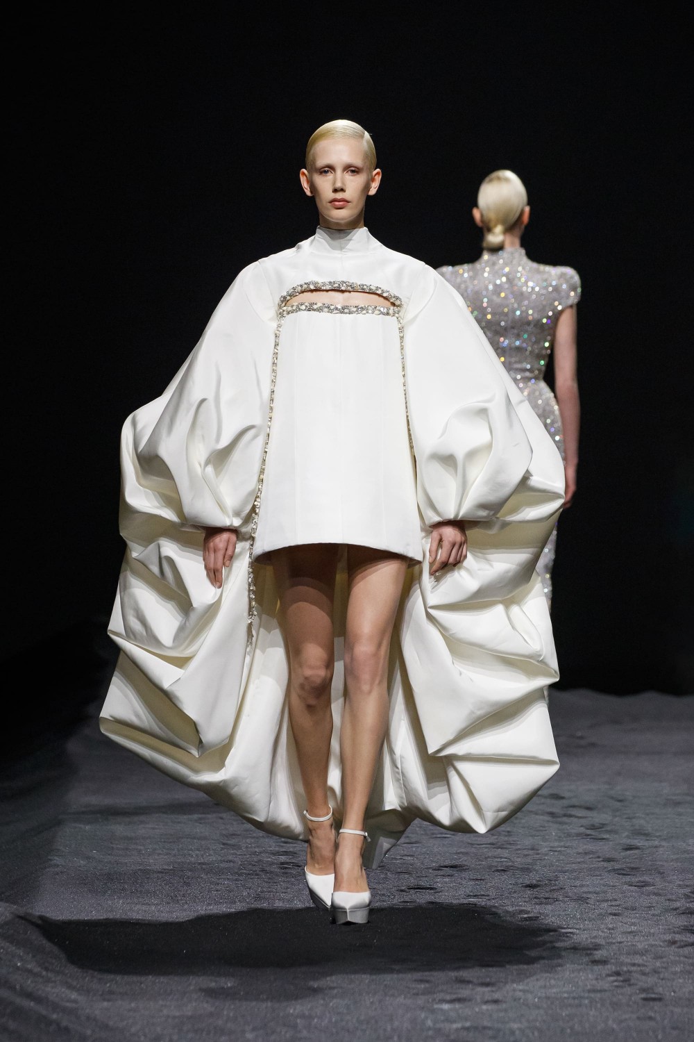 Наряды представляют собой возвращение бренда к истокам, сохраняя при этом чистые линии силуэтов. Текстуры состоят из измельченной органзы и прядей мохера, аппликаций из вулканического хрусталя и щебня с подвесками из жемчуга в гармоничных сочетаниях. Коллекция рассказывает эпическую историю любви Пенелопы и Ориона — двух влюбленных, заблудившихся между отдаленными мирами. Облегающие фигуру очертания в изделиях словно героические доспехи, а раздутые формы имитируют естественные скальные образования.