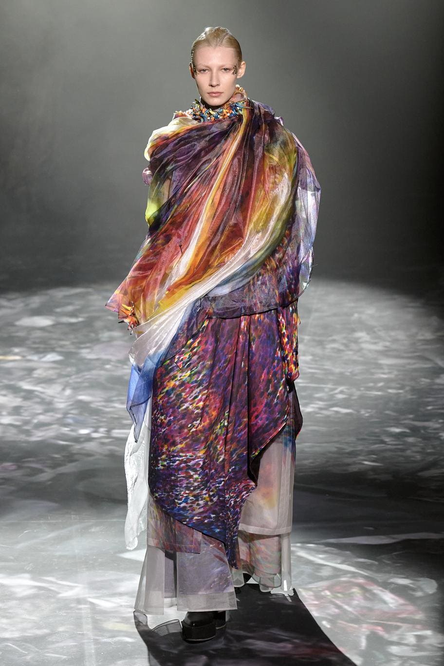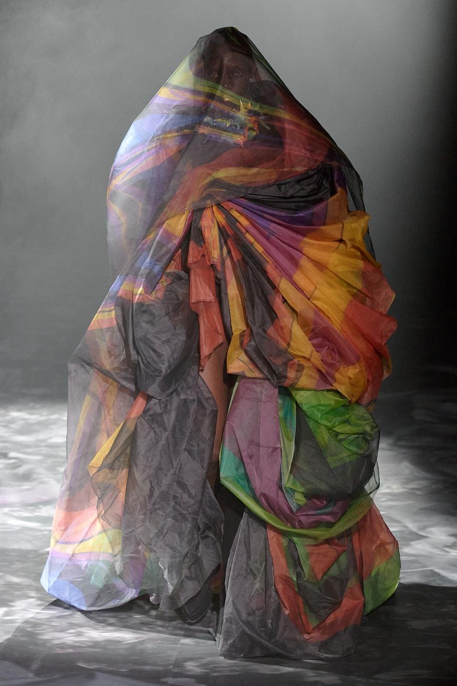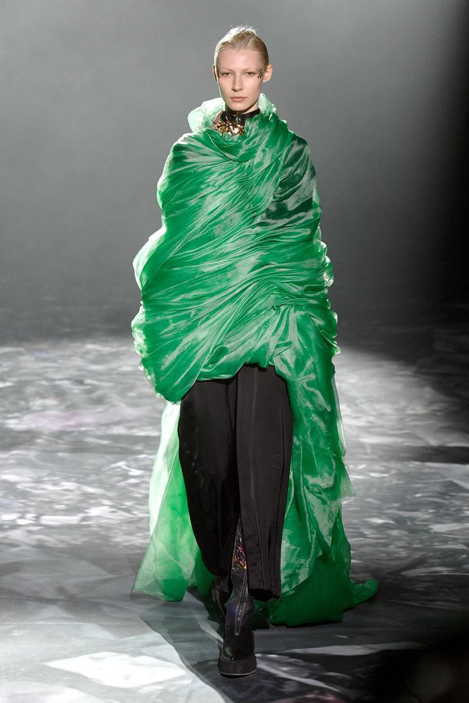 Японский дизайнер призывает задуматься о будущем индустрии своей коллекции — она была выполнена из гор текстильных отходов. Идея родилась во время поездки в Кению — места, где собирается весь мусор быстрой моды. Также он отдает дань уважения драпированным и завернутым предметам одежды африканского континента. Уникальность и редкость для высокой моды — все представленные образы унисекс.