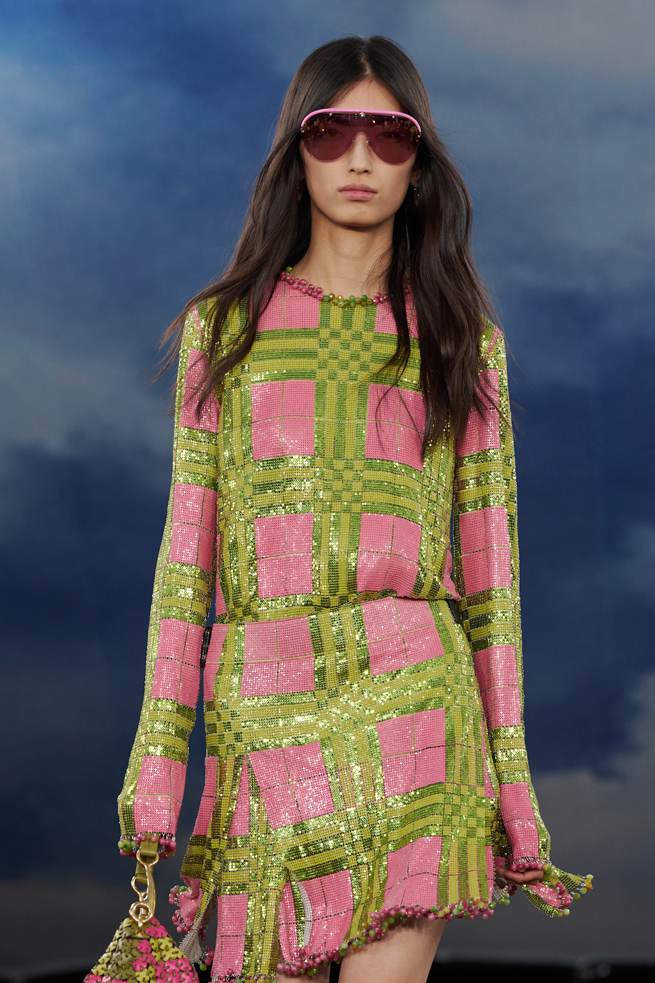 Для вечерних выходов Ли подготовил мини-килты, усыпанные пайетками в знаковую клетку, и платья, вдохновленные Франсуазой Арди и другими культовыми иконами моды шестидесятых.