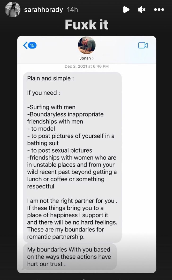 Сара Брэди опубликовала в Instagram серию скринов из чата. «Это предупреждение для всех девушек. Если ваш партнер разговаривает с вами подобным образом, составьте план по отступлению», — подписала их девушка.
