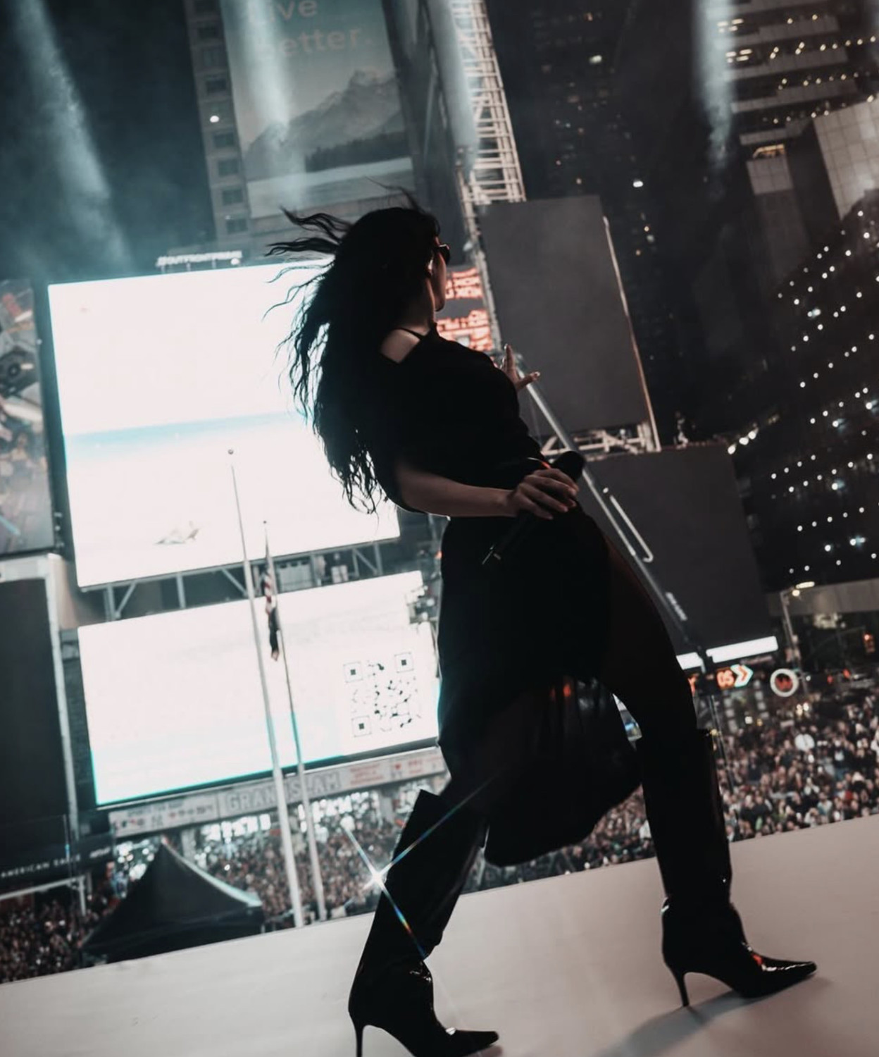 За полчаса до начала события в Сети появились уведомления, и тысячи поклонников музыки, моды и просто любопытных жителей города заполнили площадь. На сцене певица исполнила свои хиты, включая 360, Von Dutch и ремикс Guess, окруженная неоновыми огнями и визуальными эффектами.