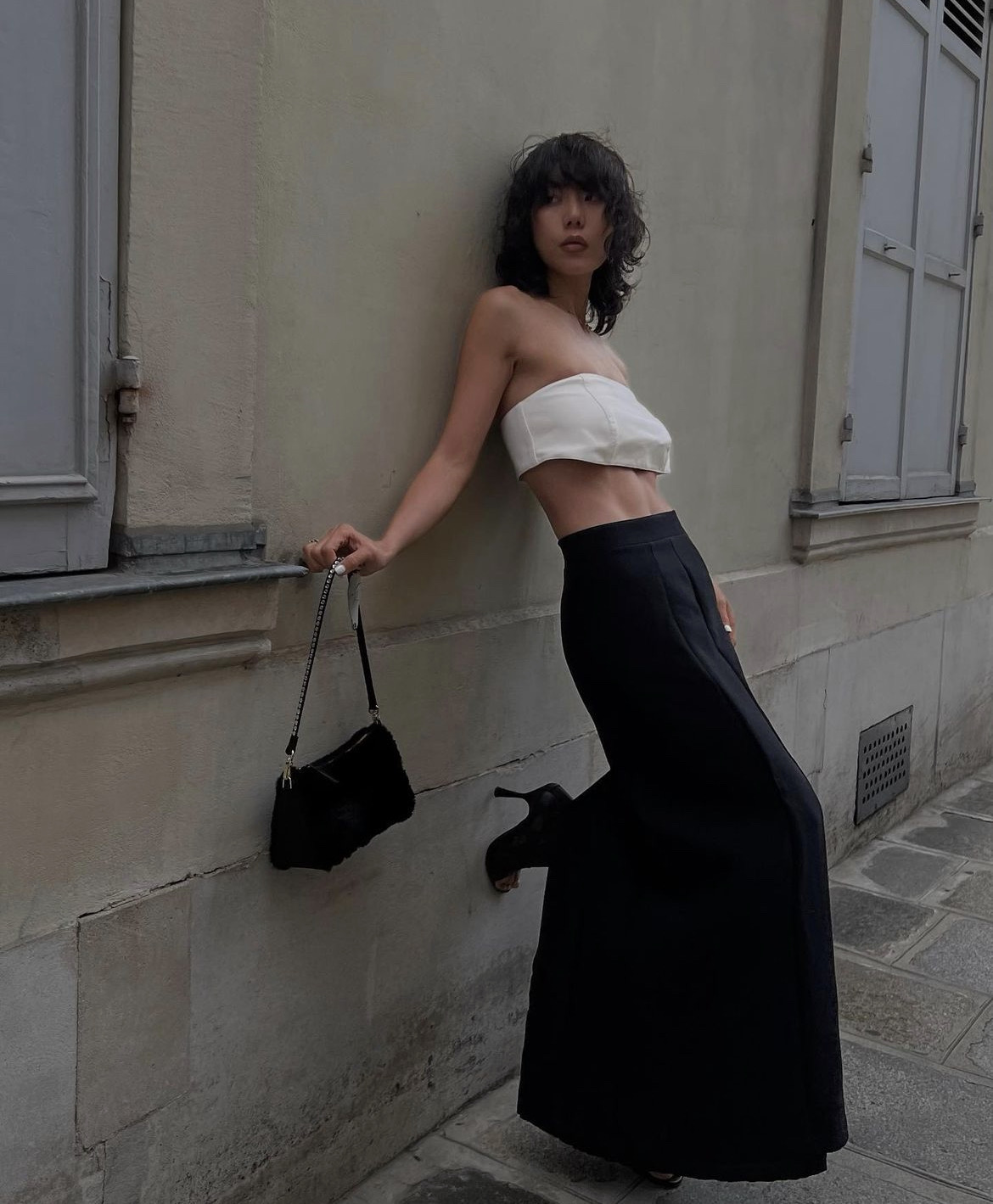 Загадочный и одновременно интригующий образ — идеальная опция для любительниц тонких граней. Многие побаиваются надевать кроп-топы, но в этом образе юбка длины макси сыграет на контрасте. В результате вы получите гармоничный аутфит.