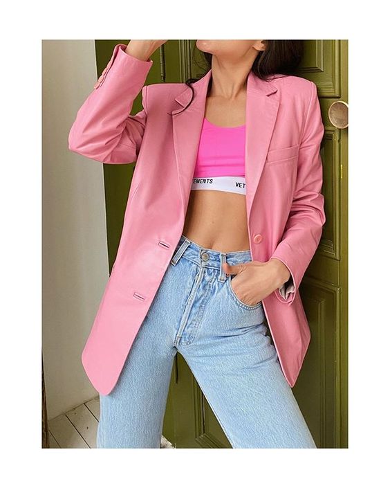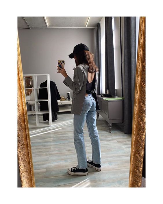 Пиджаки бывают разными по цвету и форме. Розовый пиджак со спортивным кроп-топом, открывающий линию живота – от этих слов уже поднимется настроение. Бывают пиджаки классические, а бывает дизайнерское решение оставить спину открытой. Разбавив джинсы прямого кроя, кеды на платформе и бейсболку таким неординарным решением, разве может это не выглядеть женственно?