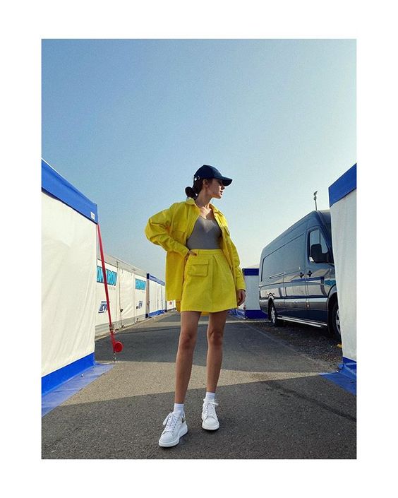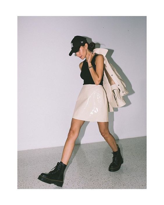 Катя комбинирует виниловые жакет и юбку с грубыми ботинками бренда Dr. Martens. Разбавляет жакет и юбку спортивного стиля в ярко-желтом цвете объемными кедами Alexander McQueen. Каждый из этих вариантов приправлен бейсболкой, которая является неотъемлемой составляющей образа.