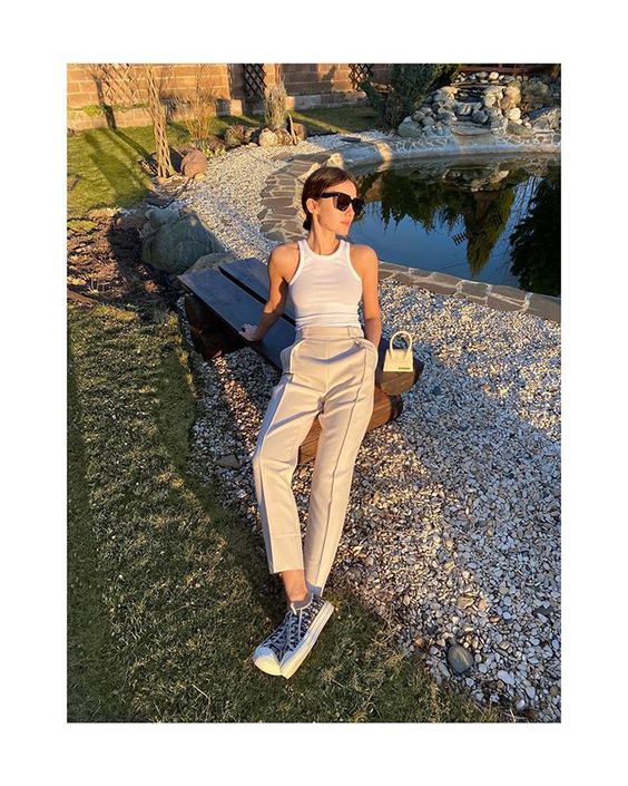 Майка, классические брюки, мини-сумка бренда Jacquemus и акцентные кеды от Dior – делают образ удобным, стильным и безукоризненным.