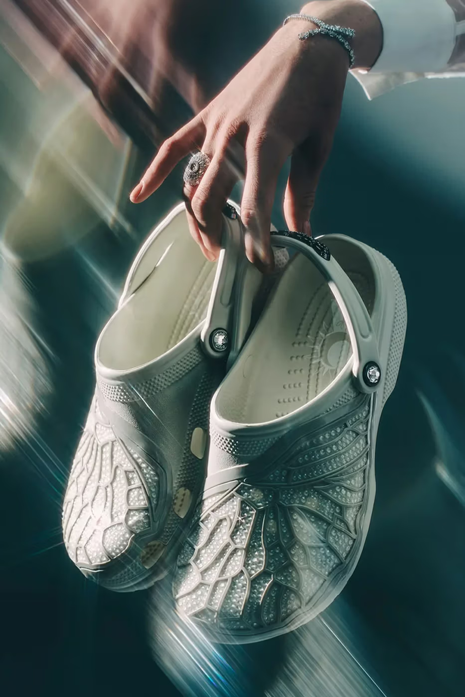 В новую коллекцию вошли две модели: Classic Clog и Bae Clog — и обе с блеском. Буквально. Первая модель — в сером оттенке, с хрустальной отделкой и полупрозрачной «клеткой», а вторая — на платформе, с кристаллами по всей поверхности. Для тех, кто хочет еще больше сияния, предусмотрены специальные jibbitz — съемные украшения для сабо.
