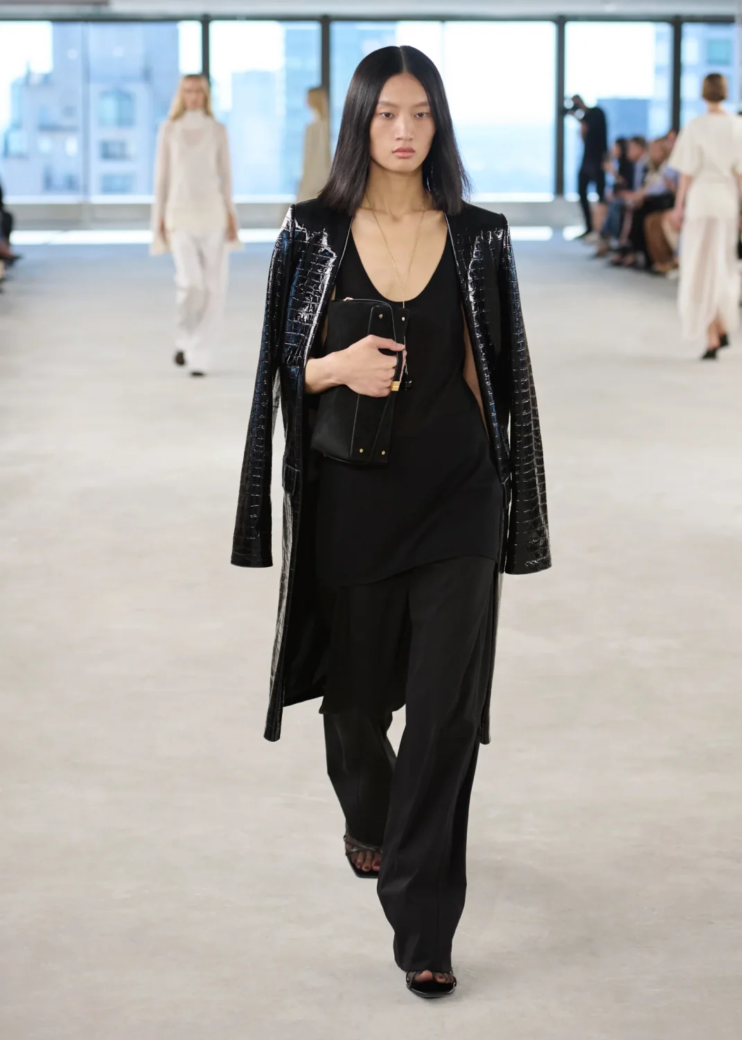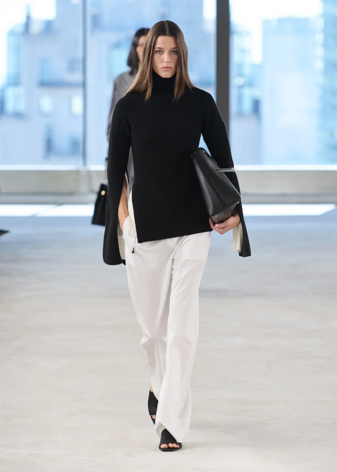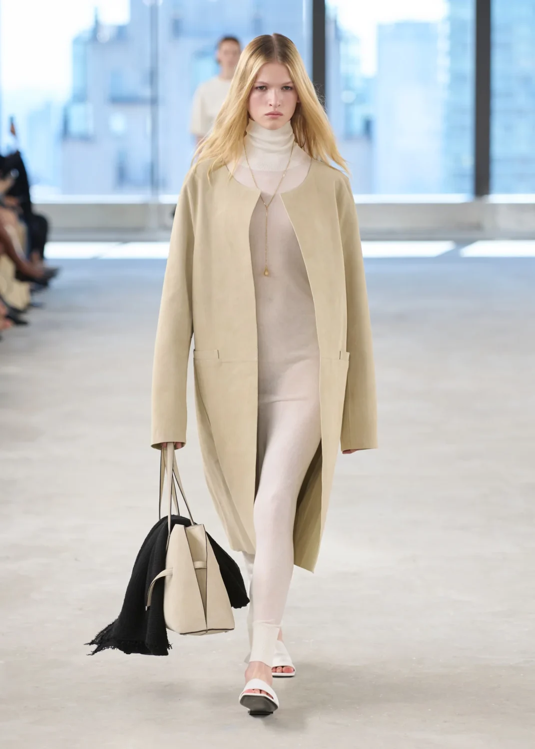 Под руководством основательницы Элизабет Клинг, Toteme сохраняет преданность собственному стилю и в этом сезоне. Каждое изделие, представленное на подиуме, выглядит так, словно взято из гардероба самого дизайнера. «Моя палитра в основном черно-белая, именно так я чаще всего одеваюсь. Мне нравится, как ткани взаимодействуют друг с другом — например, черная замша и черный хлопок создают интересный эффект», — рассказывает она о своем подходе, отмечая, что нет необходимости в изобилии цвета, чтобы выразить индивидуальность. Порой достаточно лишь игры текстур.