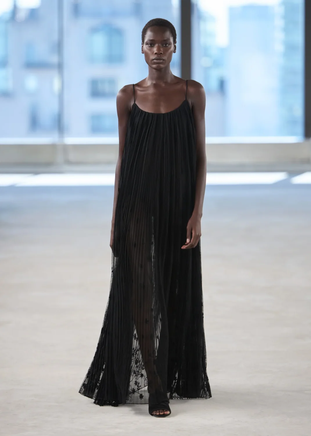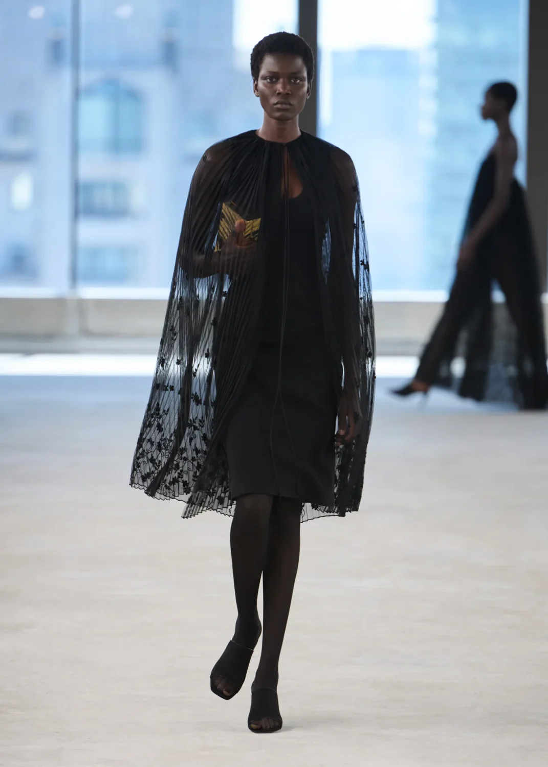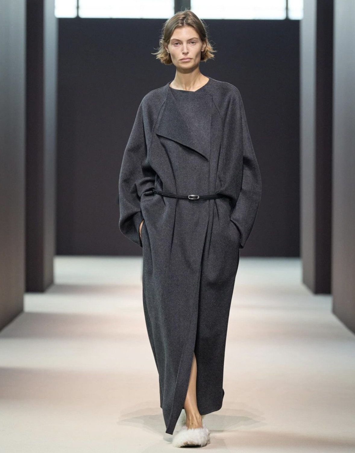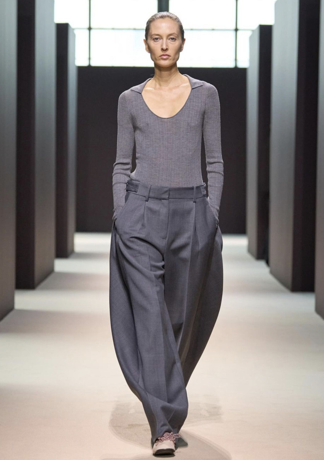 Под руководством основательницы Элизабет Клинг, Toteme сохраняет преданность собственному стилю и в этом сезоне. Каждое изделие, представленное на подиуме, выглядит так, словно взято из гардероба самого дизайнера. «Моя палитра в основном черно-белая, именно так я чаще всего одеваюсь. Мне нравится, как ткани взаимодействуют друг с другом — например, черная замша и черный хлопок создают интересный эффект», — рассказывает она о своем подходе, отмечая, что нет необходимости в изобилии цвета, чтобы выразить индивидуальность. Порой достаточно лишь игры текстур.