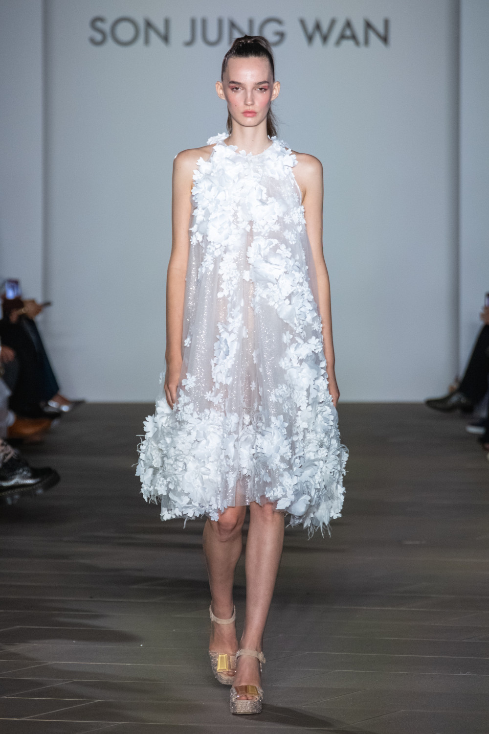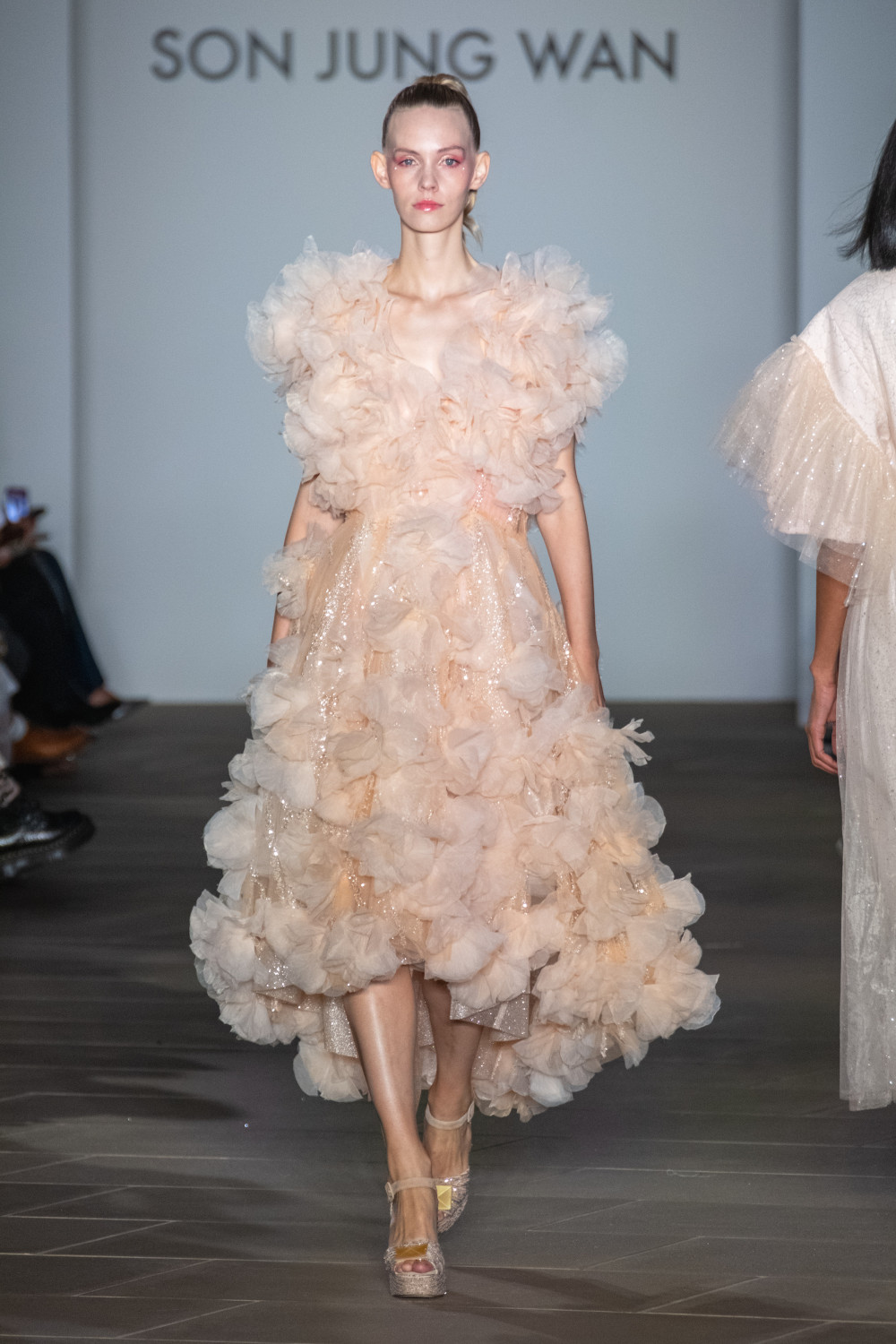 Южнокорейский дизайнер мастерски объединил классический романтизм с современными акцентами, подчеркивая свое умение творить на стыке традиций и новаторства.Особенно нашей редакции полюбилось то, как изящные аппликации — пайетки — сочетались с тюлем и жаккардом, придавая образам утонченность и элегантность.