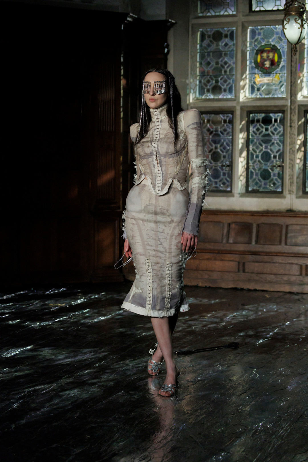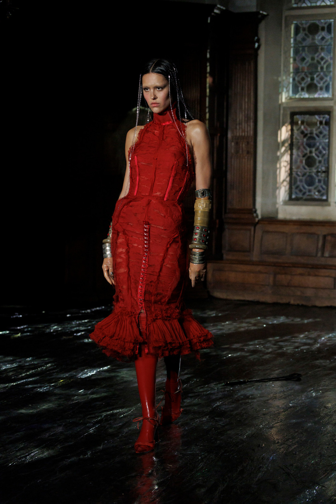 А затем — невинность уступала место бунту. На подиуме появились юбки из рваного шифона и латекса,, подчеркивающем каждую линию тела. И, конечно, Наоми Кэмпбелл — в мокром черном корсете, виниловых ботфортах и длинном плаще, который волочился по полу. Каждый из этих образов имел имя — «Scars», «Searching for me», «Unchained», «Rapture» — и вместе они рассказывали историю о травме, освобождении и поиске себя.