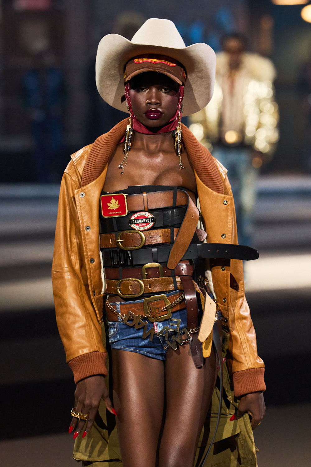 В коллекции было представлено все, за что любят Dsquared2: объемные пуховики, ковбойские сапоги, шапки-ушанки, джинсы bootcut и сандалии, которые, между прочим, носили с носками тоже. Если мужчины щеголяли в шифоновых или джинсовых рубашках, дополненных кожаными штанами, то девушки — в провокационных платьях, декорированных стразами и перьями.