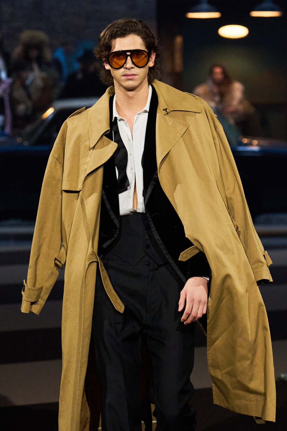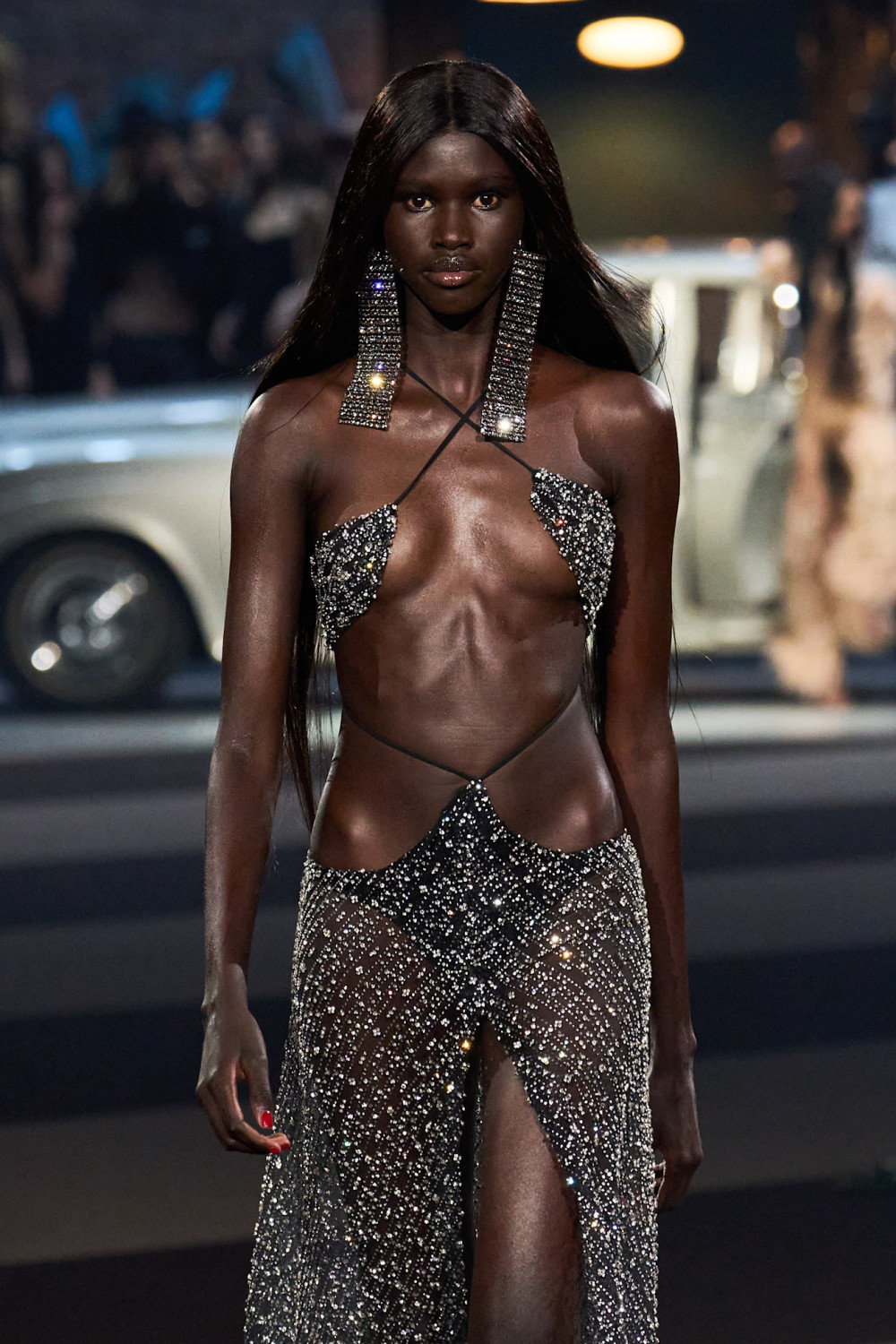 Подиум превратился в настоящий кусочек Нью-Йорка: лимузины, пикапы, желтые кэбы, из которых выходили модели, готовые погрузиться в пульсирующую атмосферу ночного клуба. Все это действо выглядело так, будто городские легенды 90-х устроили свою революцию. Здесь встретились байкеры в коже, ковбои и персонажи в духе фильмов 18+. Добавим к этому Наоми Кэмпбелл и Ирину Шейк, которые одним лишь взглядом свели всех с ума, и выступления Doechii — получаем взрывную смесь моды и поп-культуры.