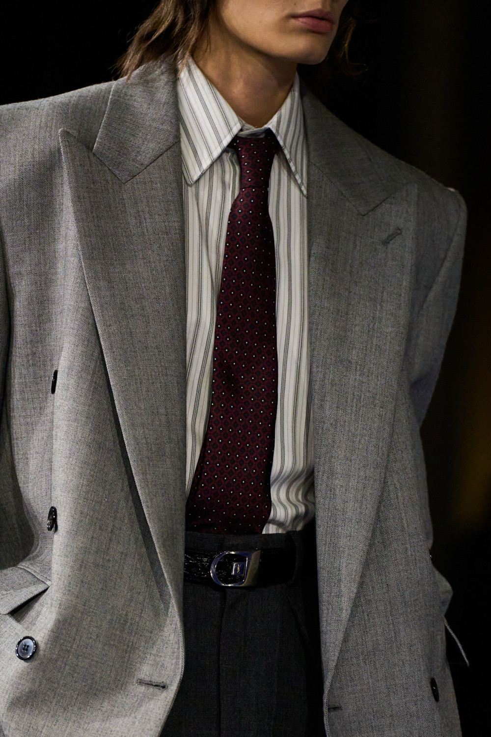 Коллекция трансформировала моделей, превращая их в своеобразных двойников Сен-Лорана. Ваккарелло отошел от прозрачных и даже провокационных образов предыдущего сезона, сделав акцент на изделиях, которые многие женщины действительно захотят носить: двубортные пиджаки и свободные брюки, кожаные бомберы и объемные тренчи, туго затянутые на талии. Эти структурированные силуэты в оттенках антрацита, черного и сливового излучали власть и контроль. От брутальных очков и золотых браслетов до бус, вдохновленных берберской культурой, — каждая деталь выглядела продуманной и завершенной, воплощая шик, который глубоко укоренен в ДНК Saint Laurent.