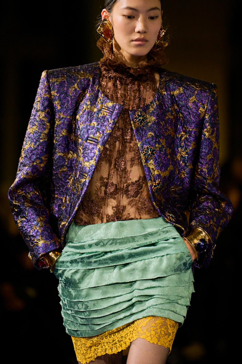 В этом сезоне Энтони Ваккарелло исследовал многогранную натуру героини Saint Laurent: уверенную в расслабленном мужском костюме с галстуком, богемную в расслабленных туниках, и экстравагантную в вечерних нарядах с яркими жакетами и кружевными мини-юбками. Коллекция доказала всем, что женщина Saint Laurent — это символ независимости, силы и желания исследовать свою темную и притягательную сторону.