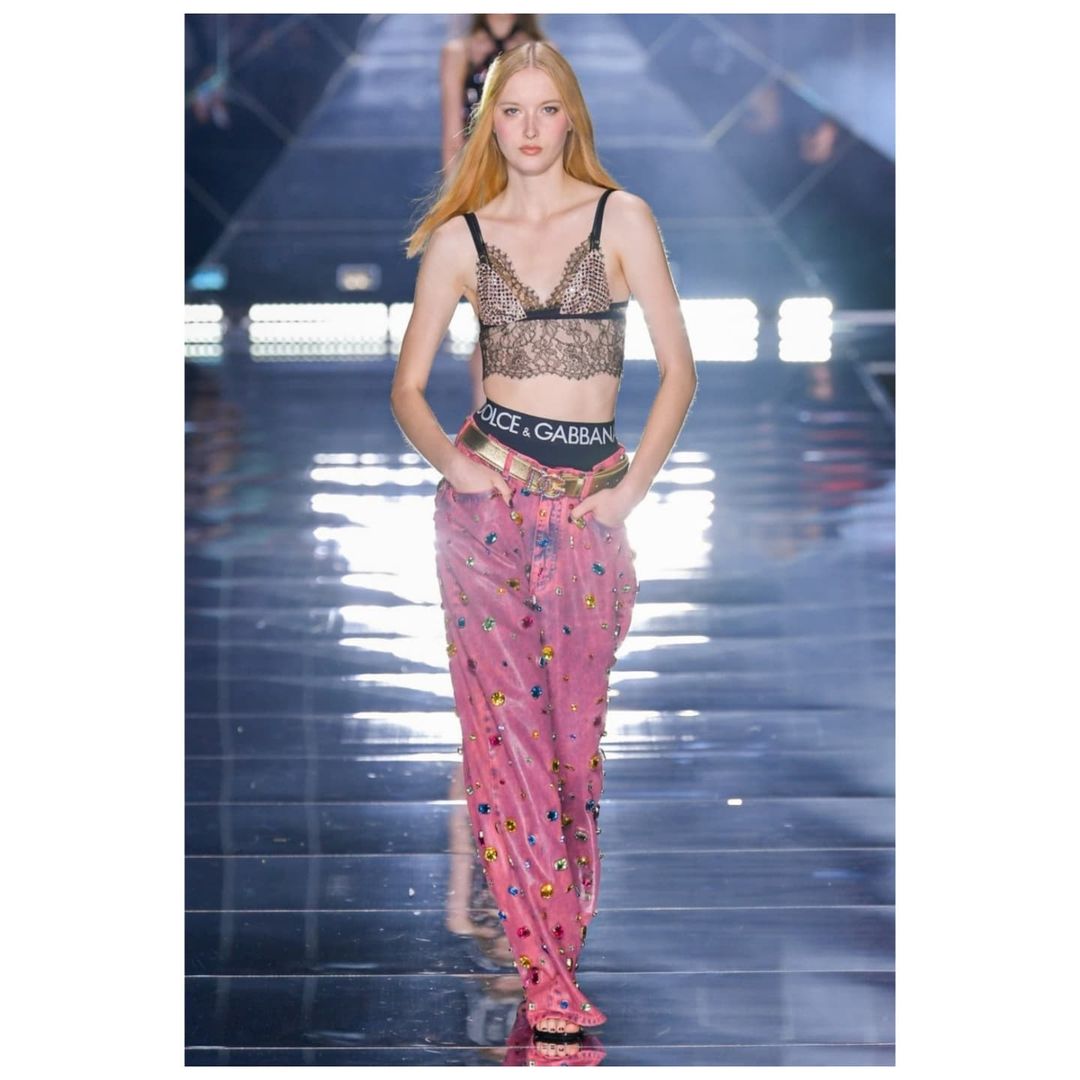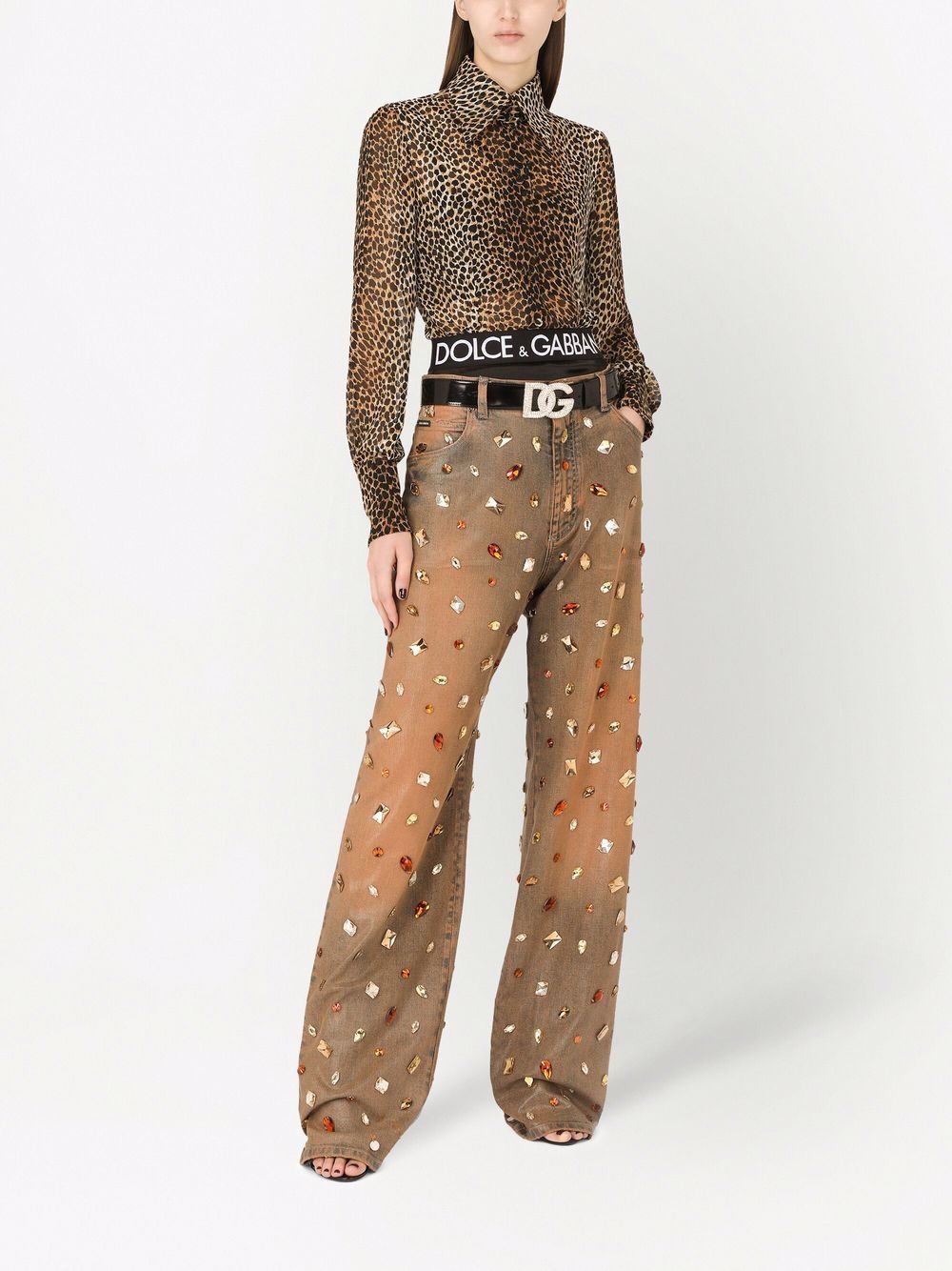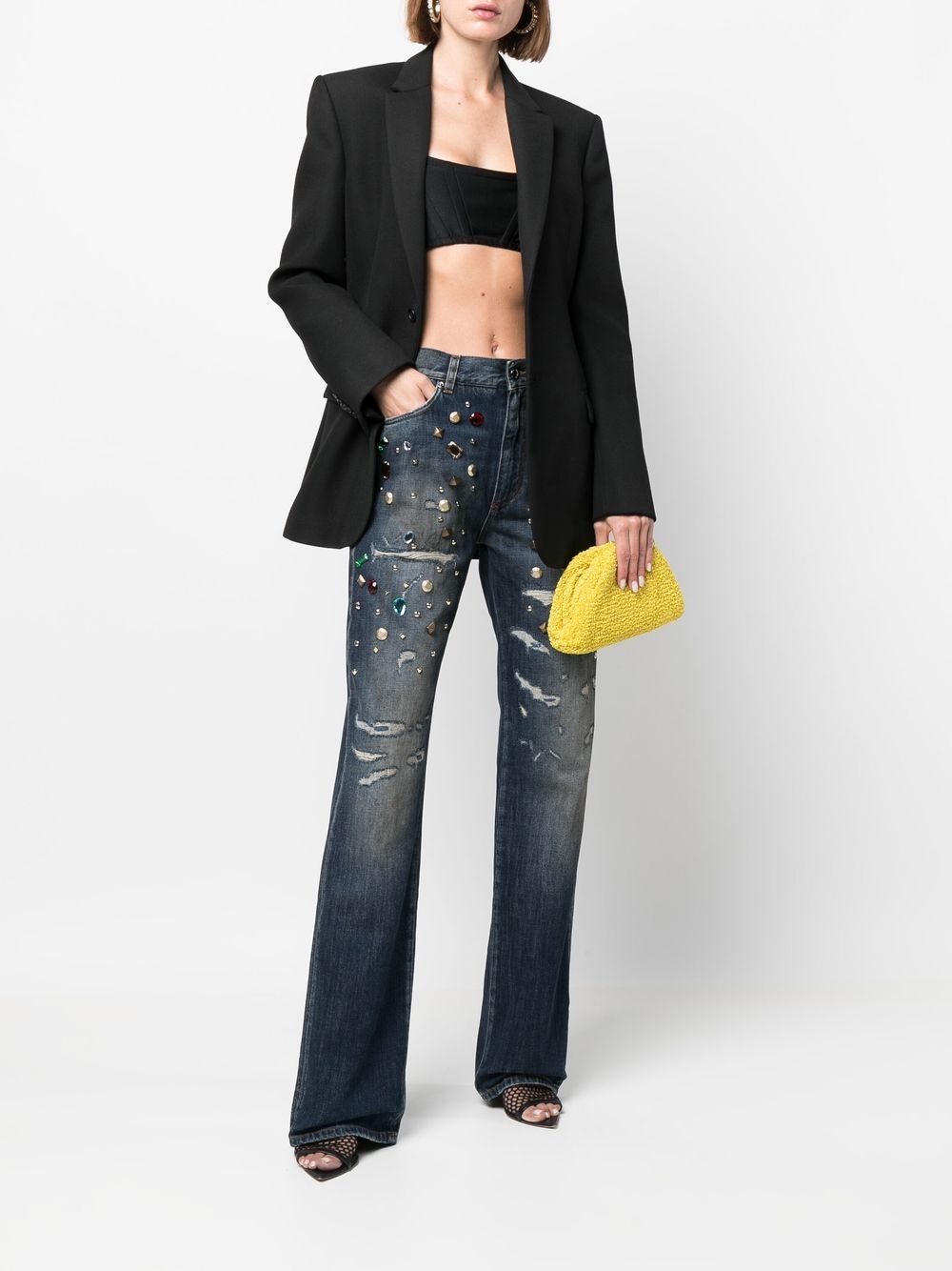 Идете на вечеринку? Наденьте джинсы с декором, которые так блистали на показе Dolce&Gabbana весна/лето 2022. Здесь главное не переборщить. Верх лучше подобрать спокойный, это может быть белый или черный топ, обувь подойдет на небольшом каблуке, к примеру босоножки или прозрачные сандалии. Однако, если все же хочется украсить верх, то рекомендуем взять его в тон джинсов с похожим узором, чтобы образ смотрелся цельным.